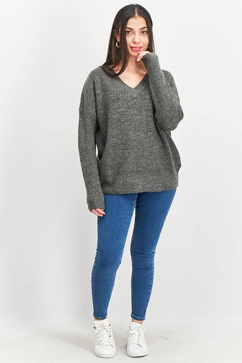 Grey Knitted V-Neck Sweater for Women.