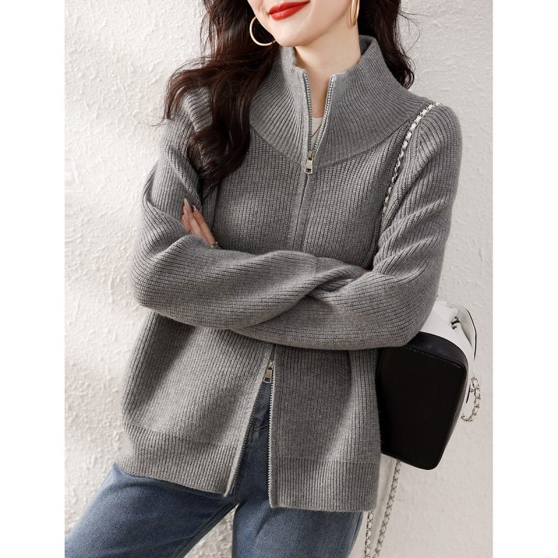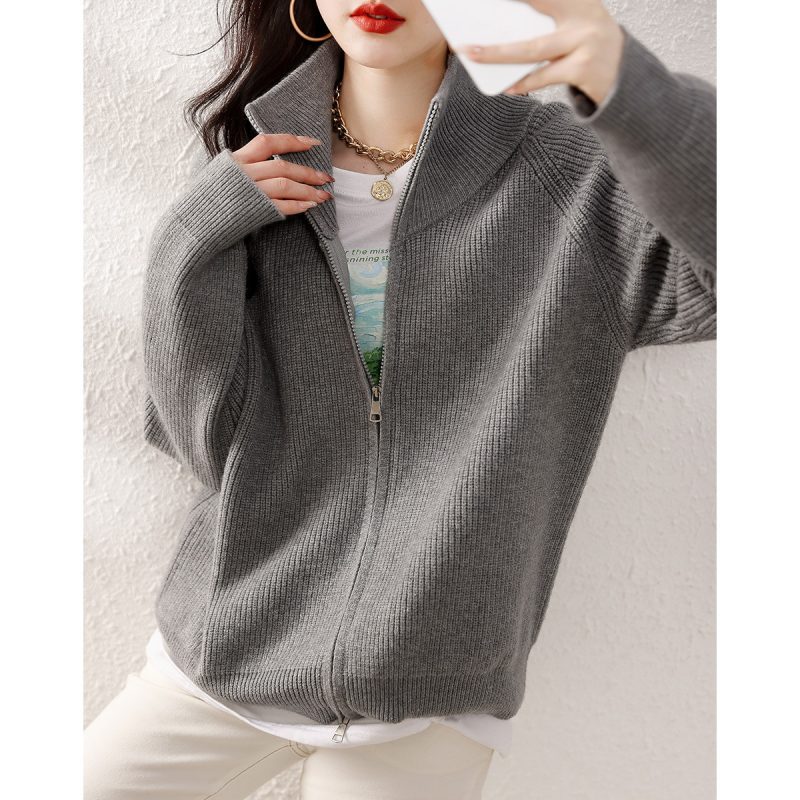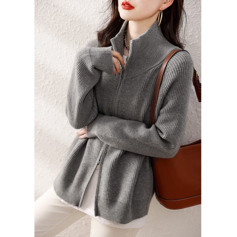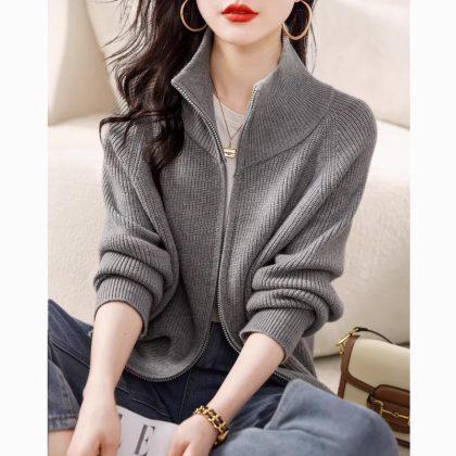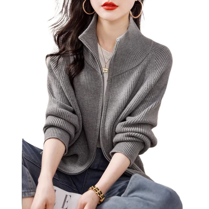 Grey Lazy Style Knitwear Zipper Jacket Women’s Spring and Winter New Korean Style Fashionable Loose Casual Slim Look Top