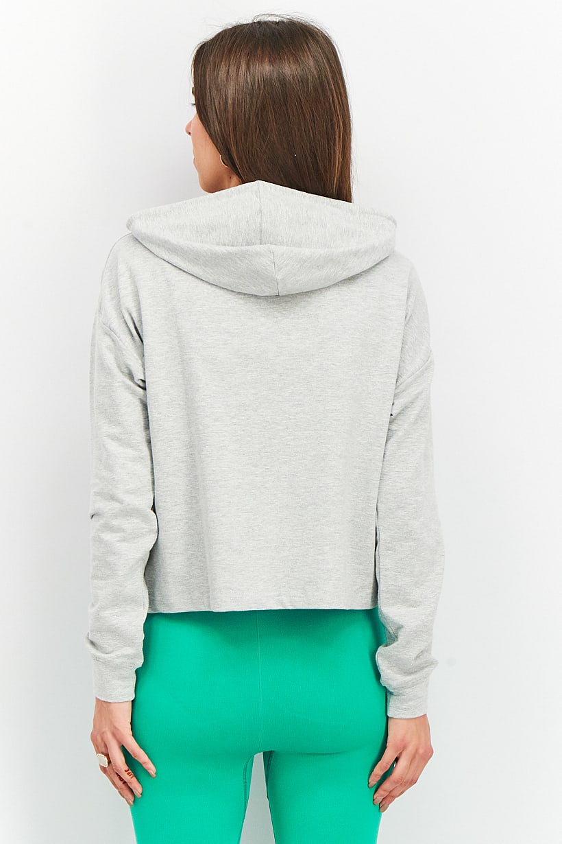 This product is designed for women who enjoy running and are looking for a comfortable and stylish sportswear fit. The hoodie features a straight hem and a hood with drawstrings, as well as a pullover closure. The long sleeves are made of a light fabric that is 93% cotton and 7% polyester, making it machine washable. The graphic print adds a touch of style to the grey color family. Please note that the product color may vary slightly due to photographic lighting sources or monitor settings. This hoodie is perfect for any sport occasion.