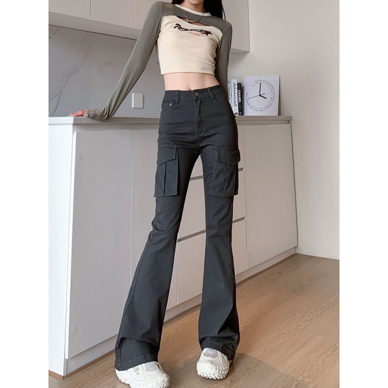 | nameOriginal | Grey Micro-La Casual Overalls Women's Spring and Summer 2024 New American Style High Waist Slimming Multi-Pocket Trumpet Pants |