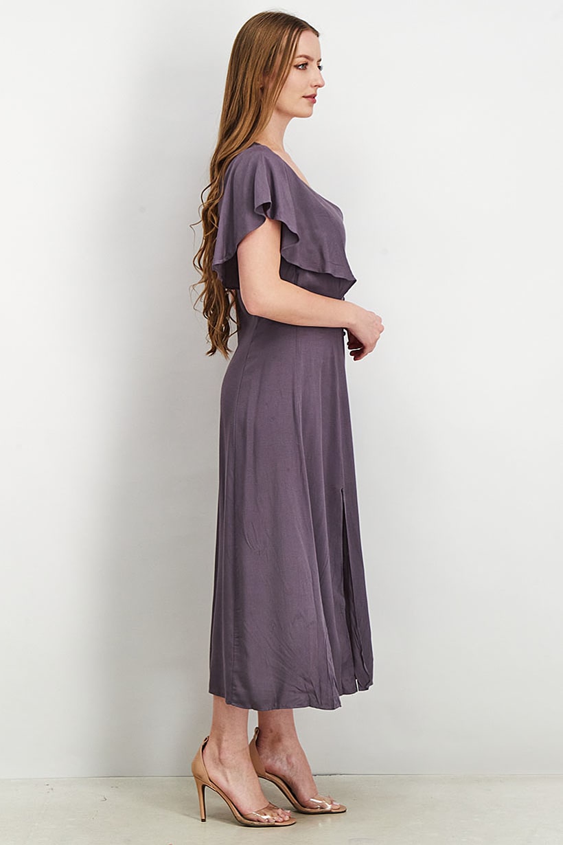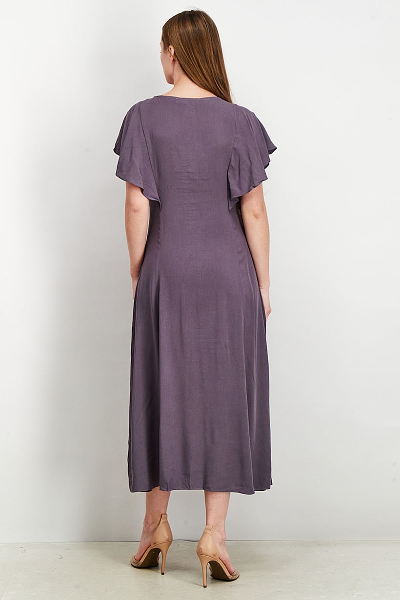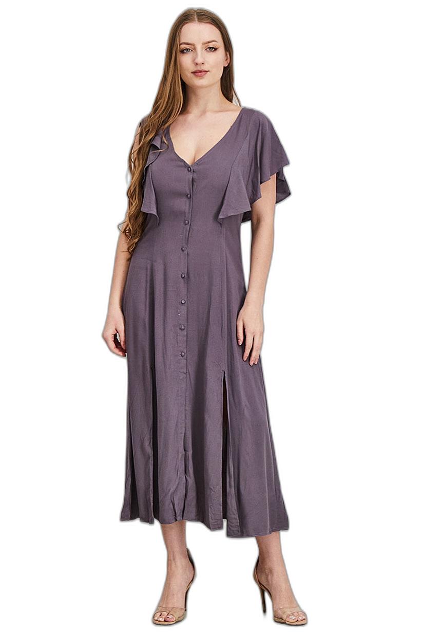 | descriptionOriginal | Care : Machine washable, Dress Style : Midi, Fit : Regular fit, Size shown : US, Types of Hem : Straight hem, Types of Neckline & Collar : V-neckline, Types of Sleeve : Ruffle sleeve, Disclaimer : Product color may slightly vary due to photographic lighting sources or your monitor settings., Fabrics : 100% Viscose, Occasion : Casual, Pattern & Print : Plain/Solid, Types of Closures : Button, Color Family : Grey, |