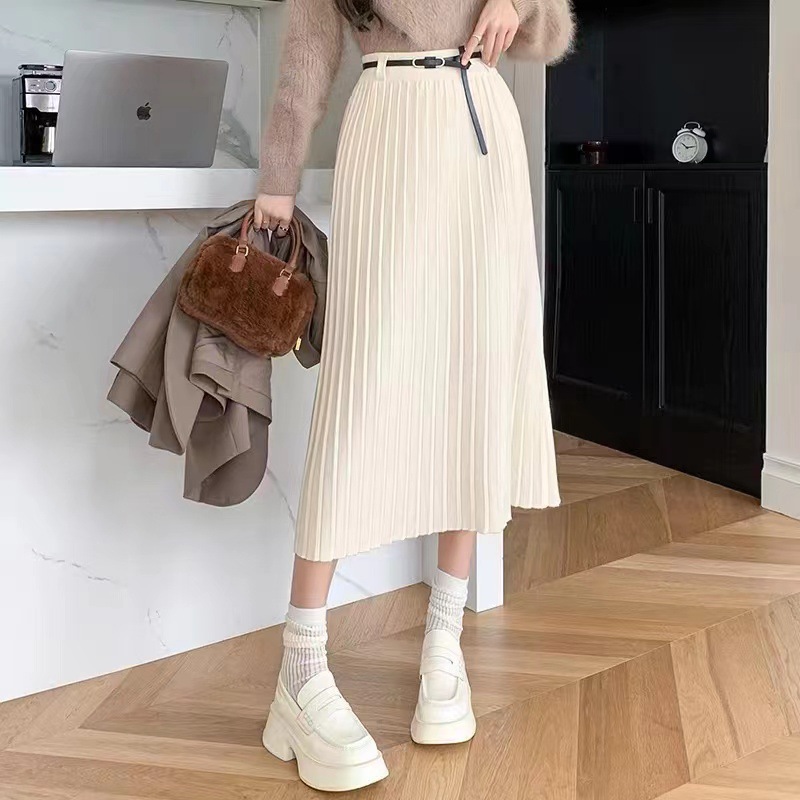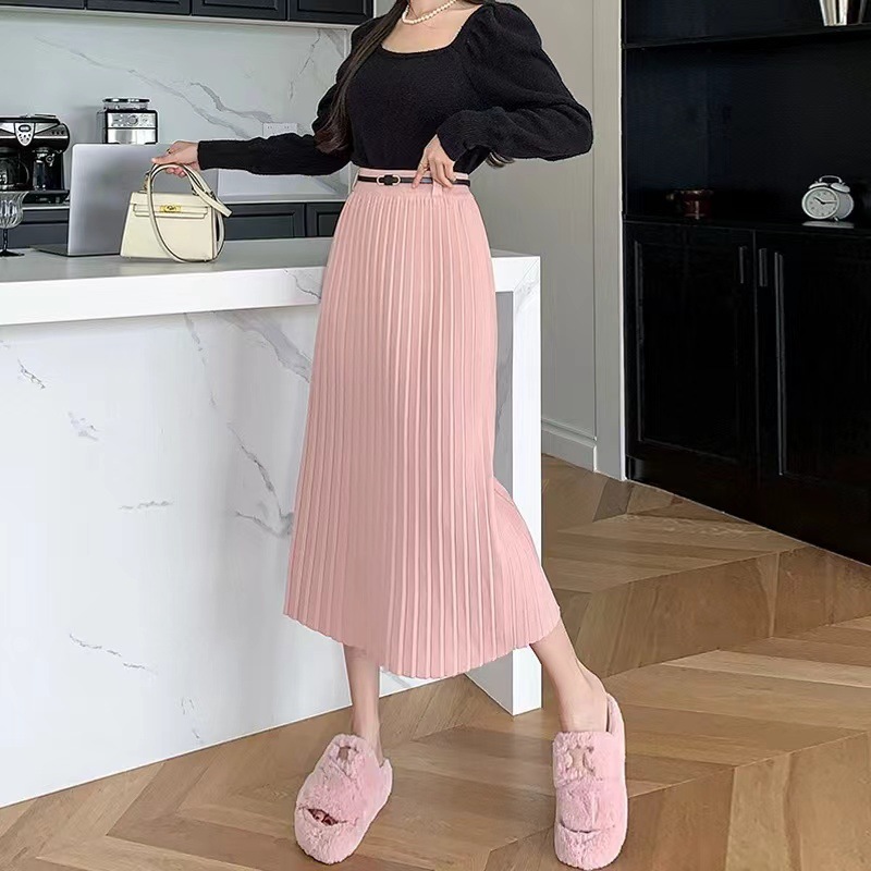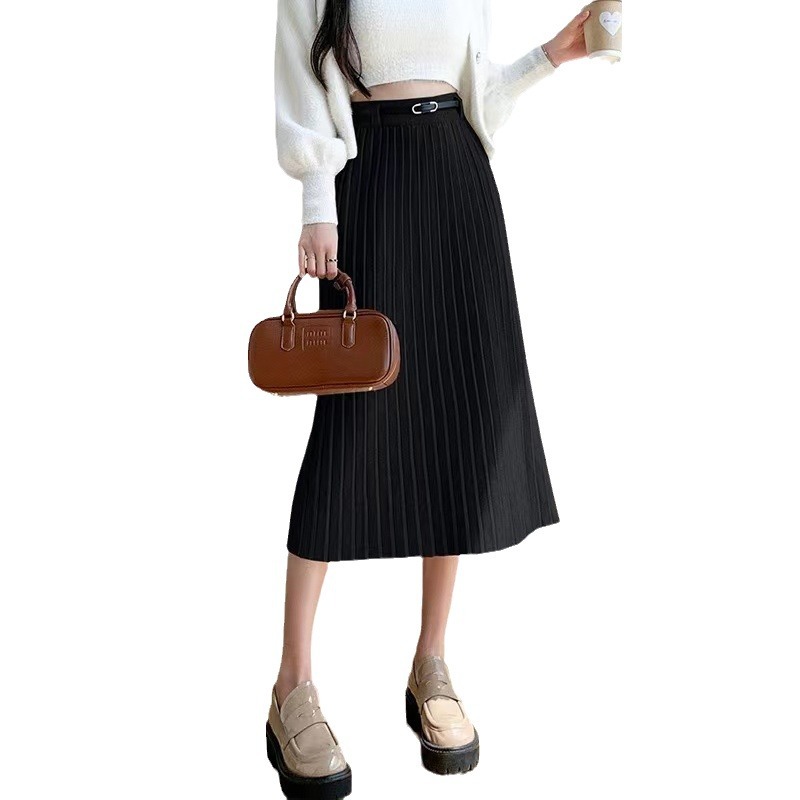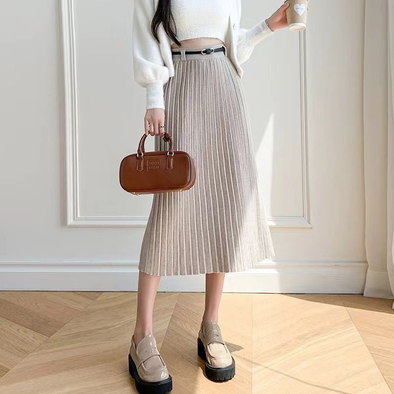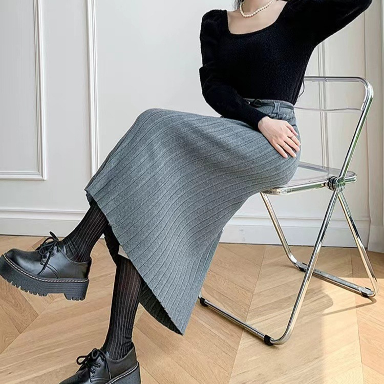Grey Pleated Knitted Skirt Women’s 2024 Spring Mid-length High-waist Design Hip Covering Slim-fit Skirt