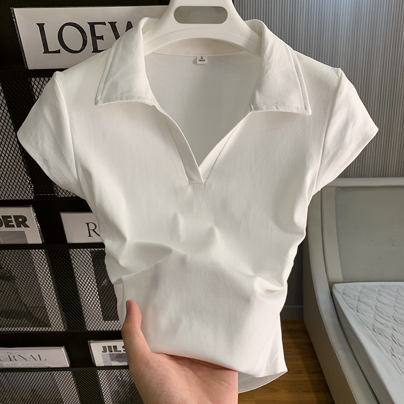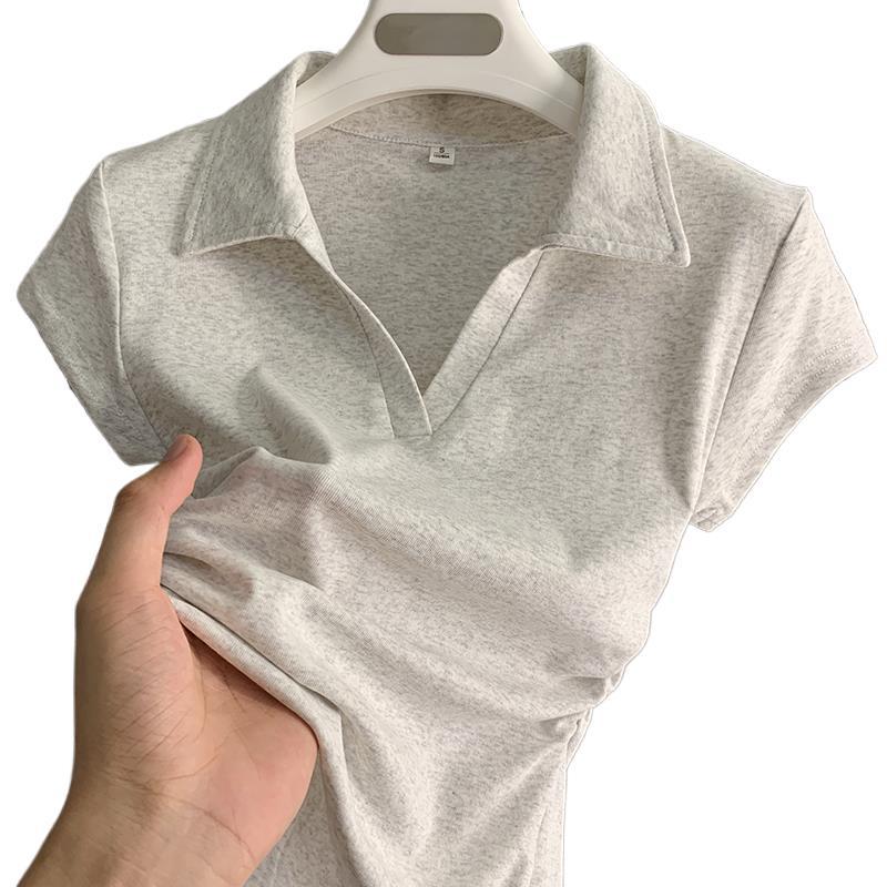 | nameOriginal | Grey Polo Collar Short-sleeved T-shirt Women's Shoulder Summer Design Sense Niche Pleated Waist Hot Girl Shoulder Top |