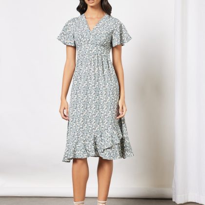 | nameOriginal | Casual V-Neck Bell Sleeve Printed Ruffle Hem Knee Length Wrap Dress Grey Print |