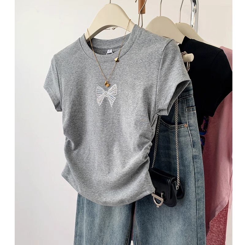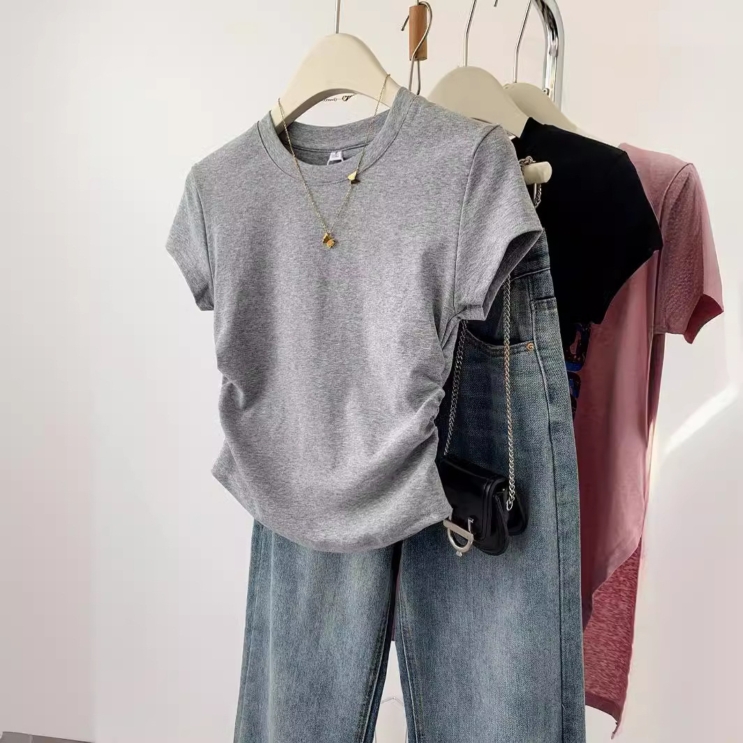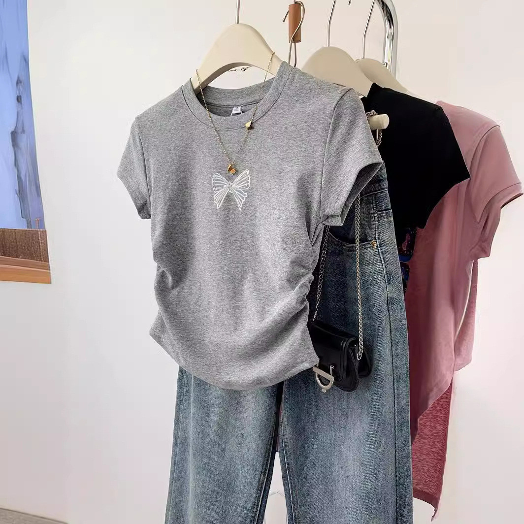 Grey Short-sleeved T-shirt Women’s Summer Summer 2024 Design Sense Small-sized Shoulder Slim-fit Slim-fit Top