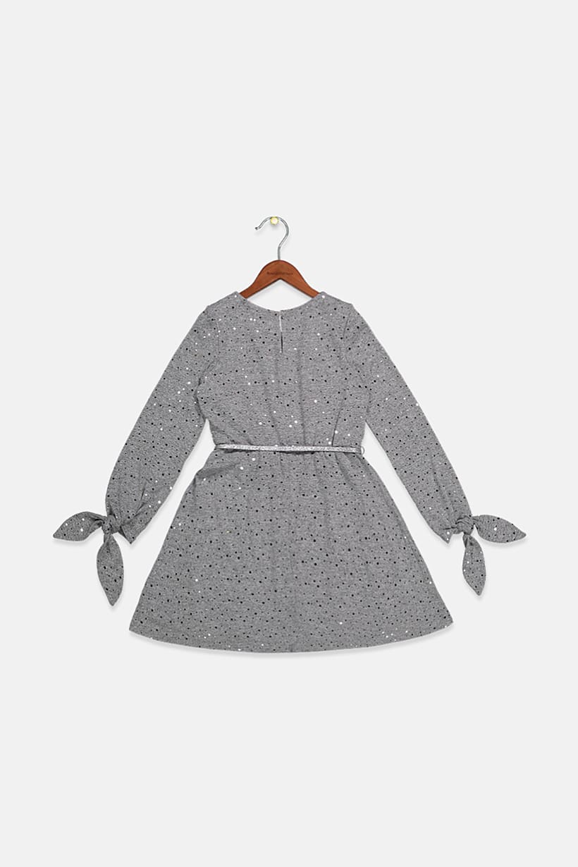 Kids Girl Textured Long Sleeve Belted Dress, Grey/Silver