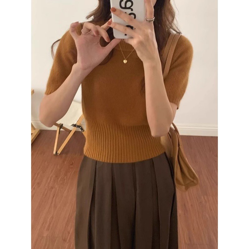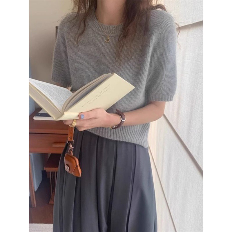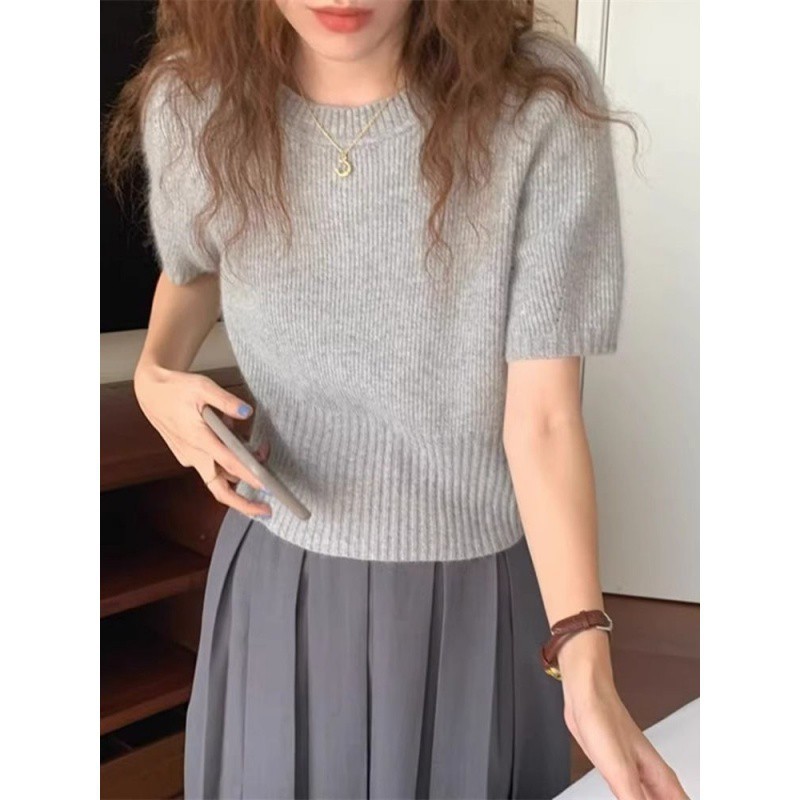 | nameOriginal | Grey Tight Waist Round Neck Short Sleeve Knitted Sweater Women's Spring and Autumn High-end Soft Waxy Inner Sweater Bubble Sleeve Short Top |