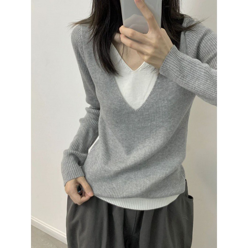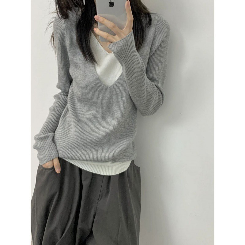| nameOriginal | Grey V-neck Fake Two-piece Sweater Women's Autumn Inner Slim-fit Slimming Design Sense Base Shirt All-match Long-sleeve Top |