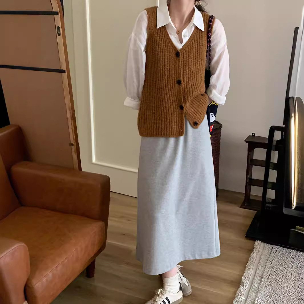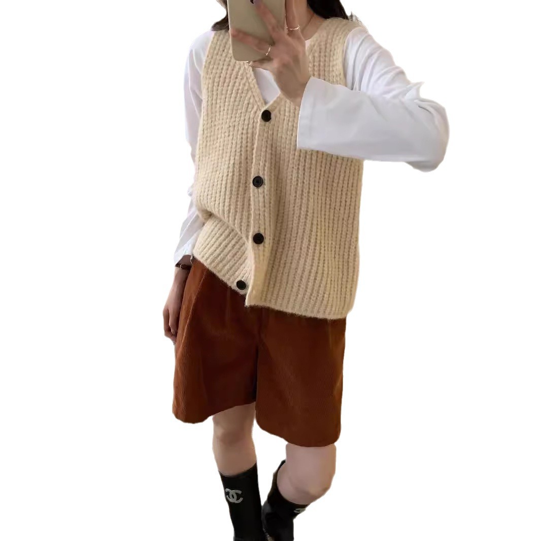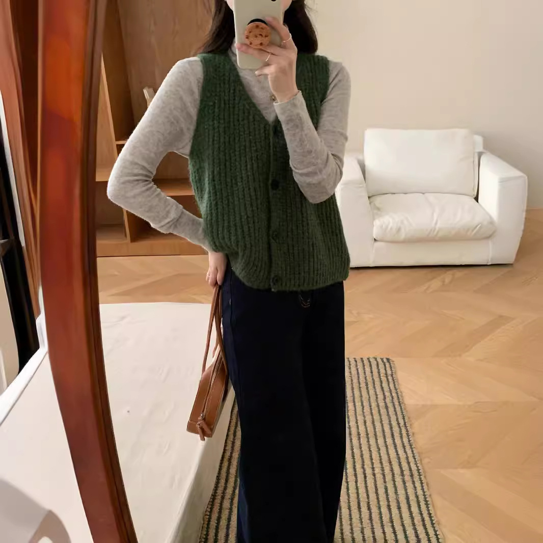 | nameOriginal | Grey V-Neck Knitted Sweater Vest Jacket Women's 2024 New Korean Style Stacked Wear Buckle Vest Sleeveless Top |
