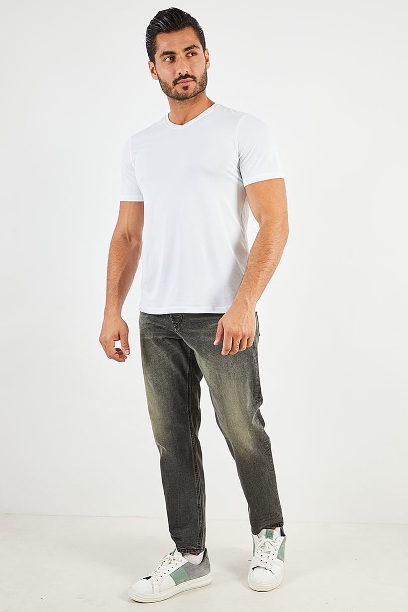 Grey Washed Stretchable Denim Jeans with Tapered Fit for Men.