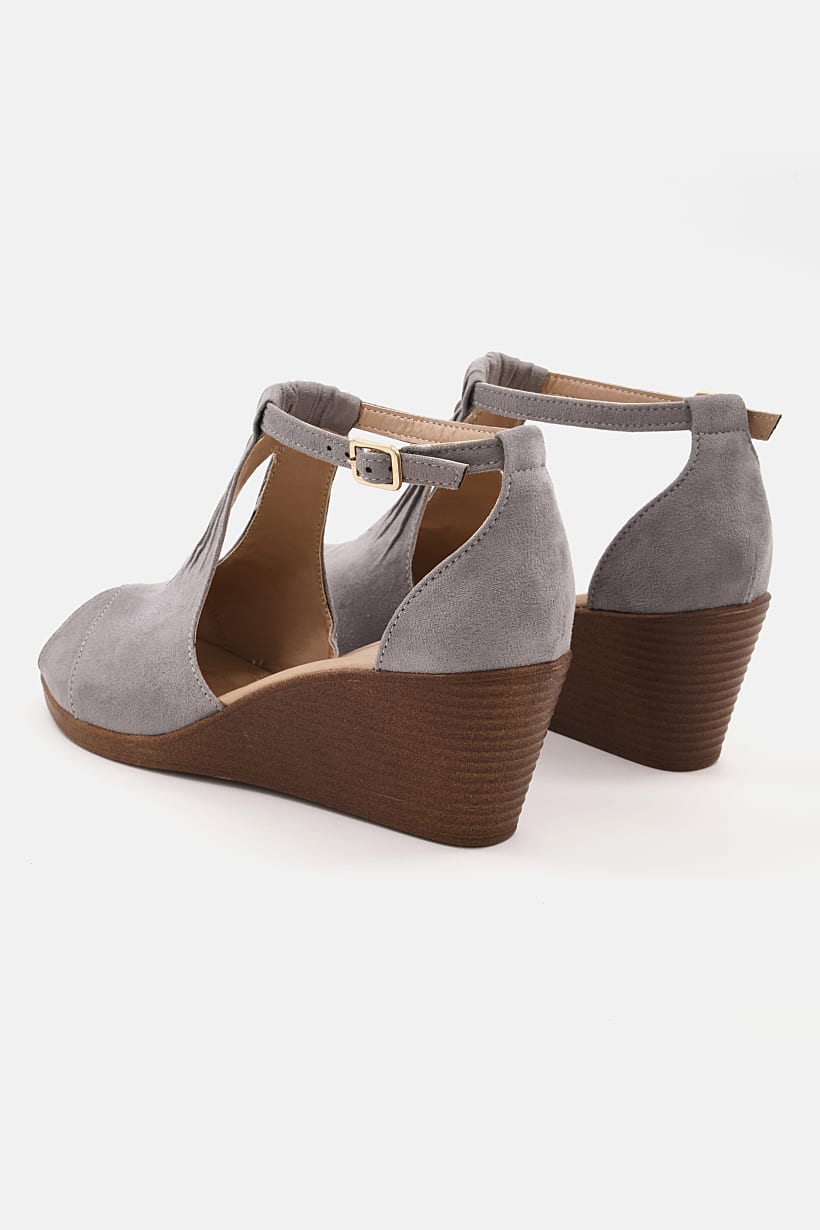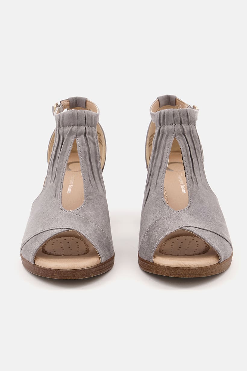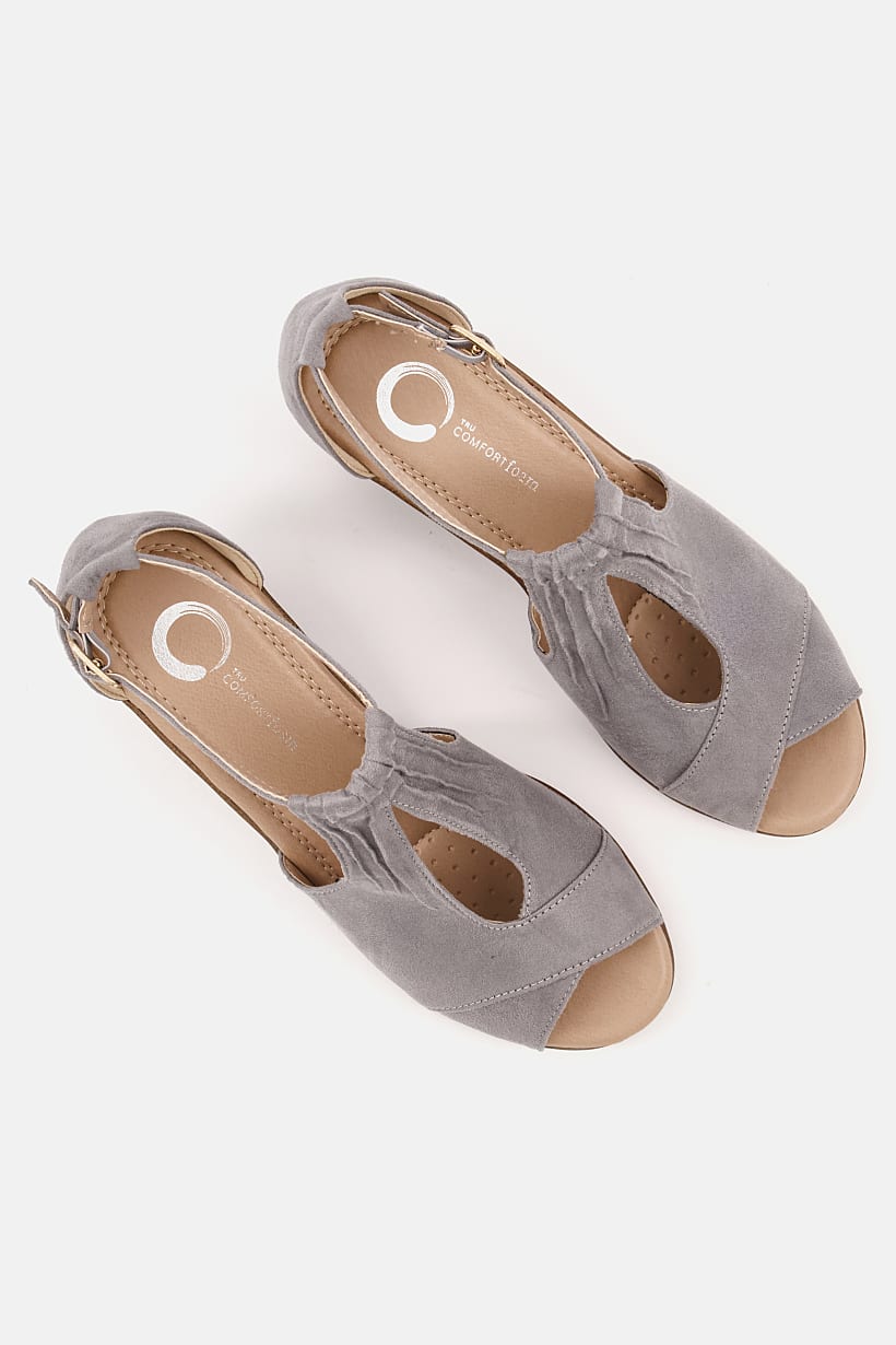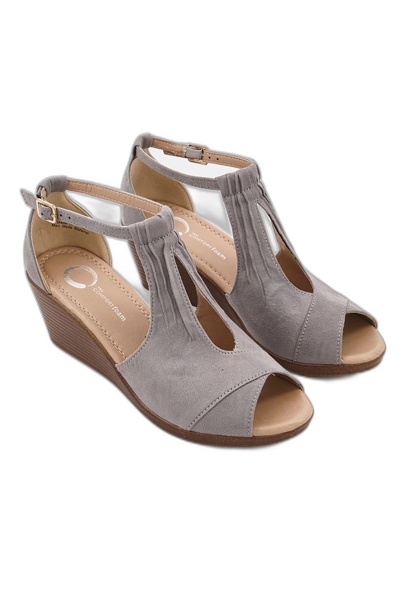 | descriptionOriginal | Heel Height : 2.75" / 6.9 cm, Heel Style : Wedge heel, Ideal For : Women, Shoe Closure : Adjustable buckle closure, Sole Material : Synthetic sole, Toe Style : Peep toe, Occasion : Casual, Shoe Material : Leather, Color Family : Grey, |