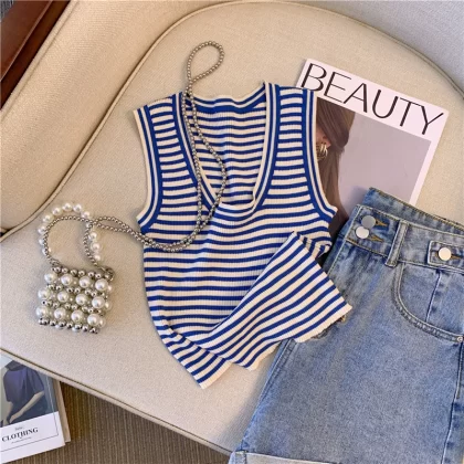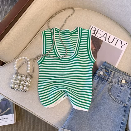 | nameOriginal | Guangzhou Thirteen Lines' hot-selling products are leaked ~ knitted ice silk striped vest for women's summer outer wear, unique sweet hot girl short style |