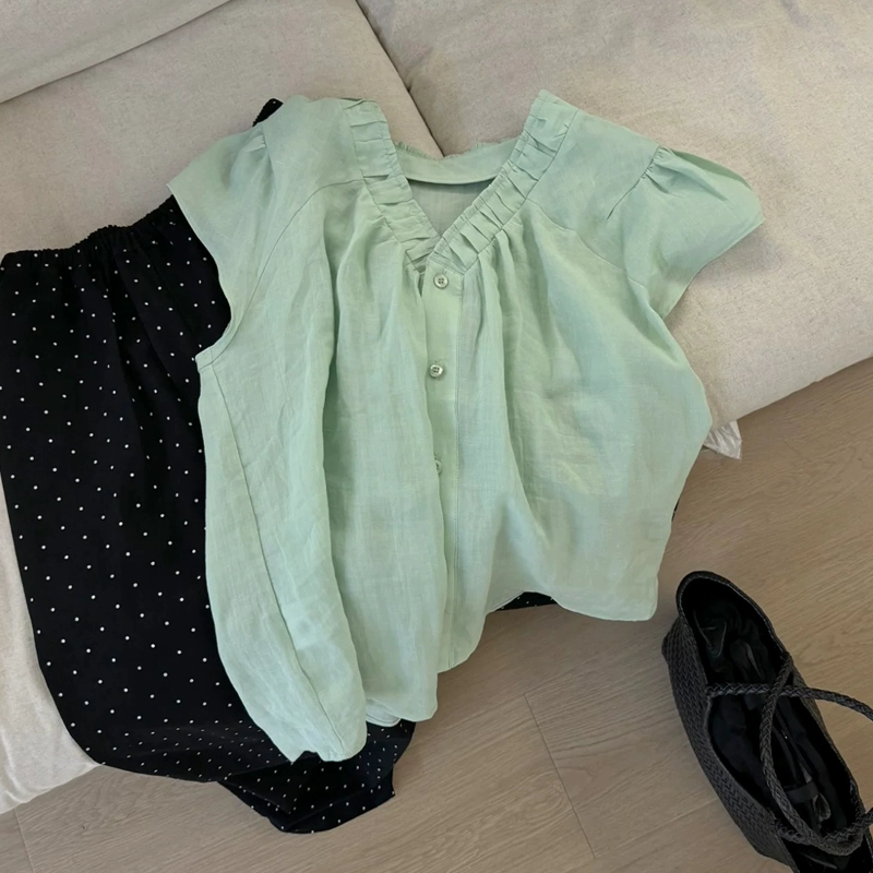 | nameOriginal | Guangzhou Thirteen Lines Hot Style~Mint Green Mambo Style New Product Slimming Belly Covering Small Flying Sleeves Shirt for Women 2024 New Style |