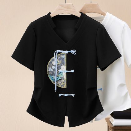 | nameOriginal | Guofeng Buckle Top Women's Summer 2024 New Retro New Chinese Unique Chic White T-shirt Women's V-neck Short Sleeve |