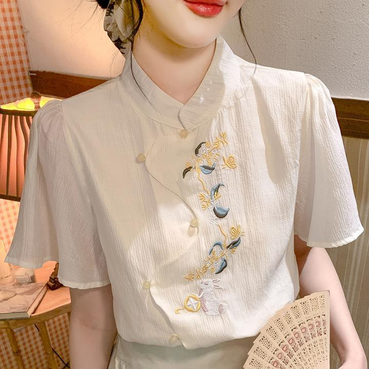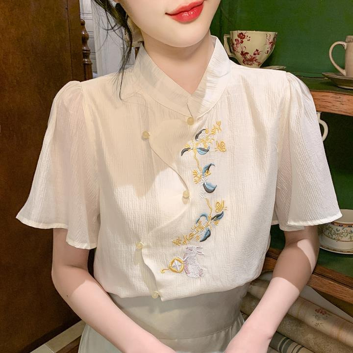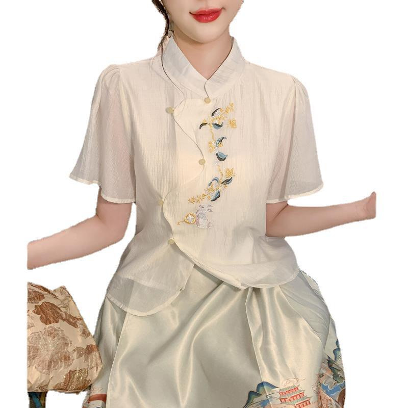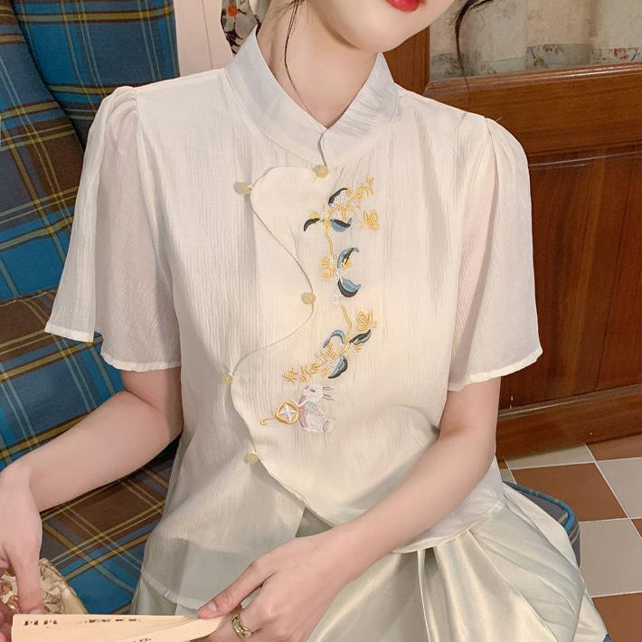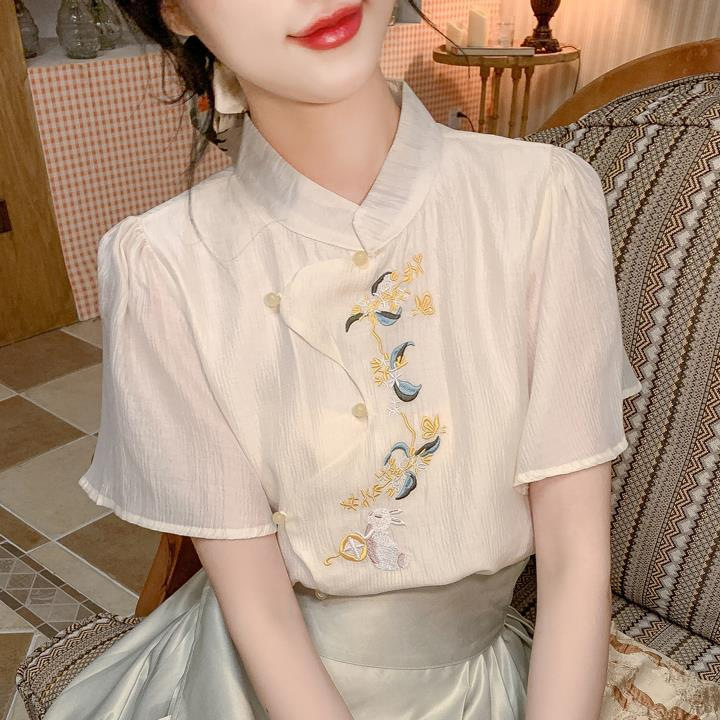 | nameOriginal | Guofeng Embroidered Shirt Women's 2024 Summer New Chinese Modified Cheongsam Top Antique Zen Puff Sleeve Chiffon Shirt |