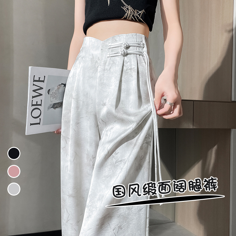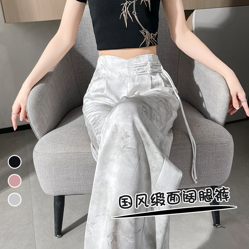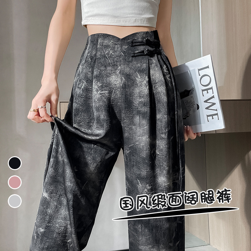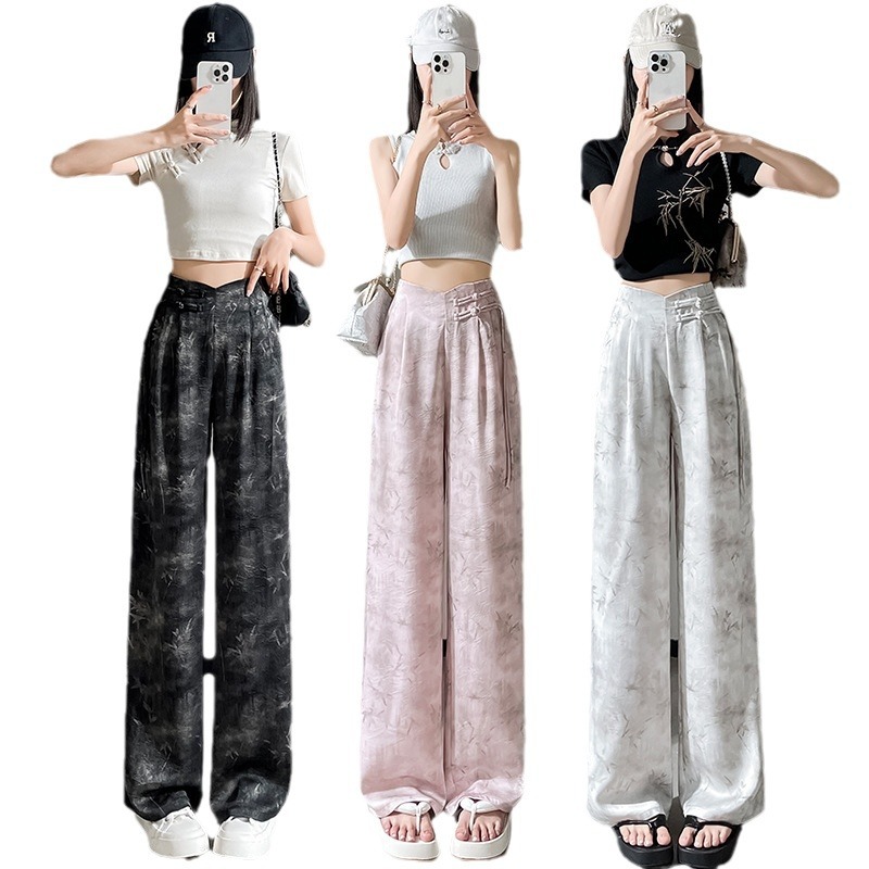 Guofeng Ink Printing Ice Silk Wide Leg Pants Women’s High Waist Straight New Chinese Style Buckle Casual Pants Summer New