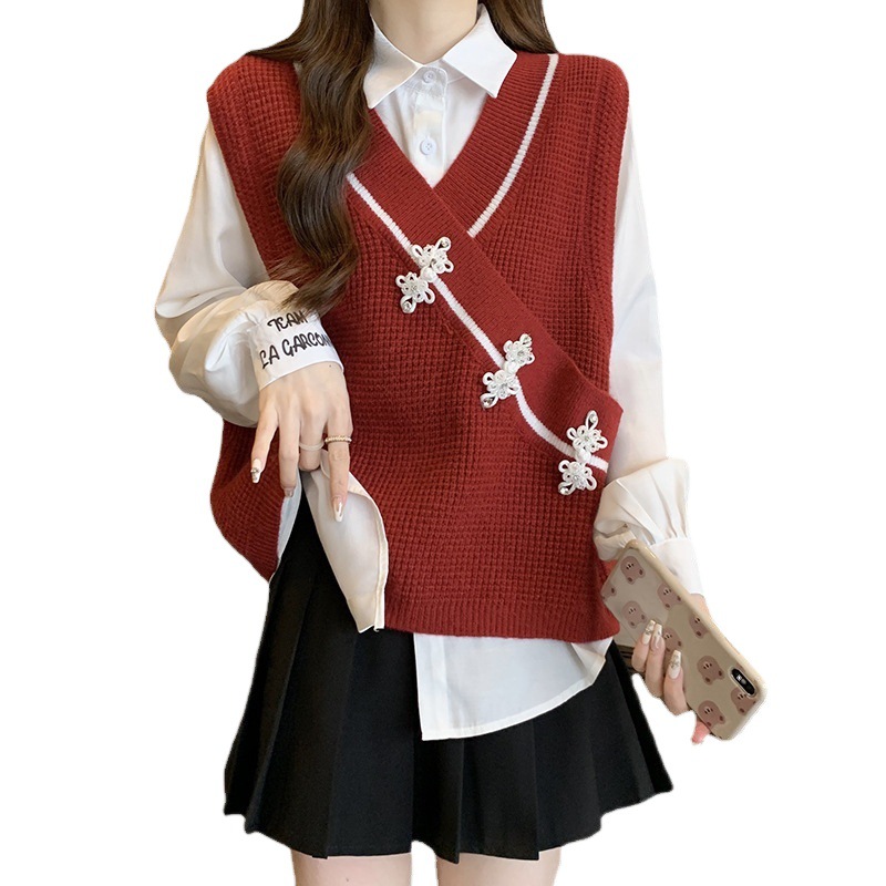 Guofeng New Chinese Style Buckle Red Knitted Vest Women’s Spring Large Size Fat Girl’s Slimming Outer Wearing Stacked Vest Top