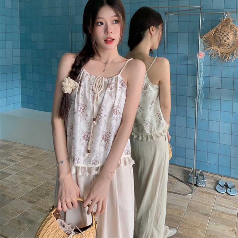 Guofeng Vintage Printed Tassel Vest Women’s Summer 2024 New Fashion Design Sense Drawstring Sling All-match Top