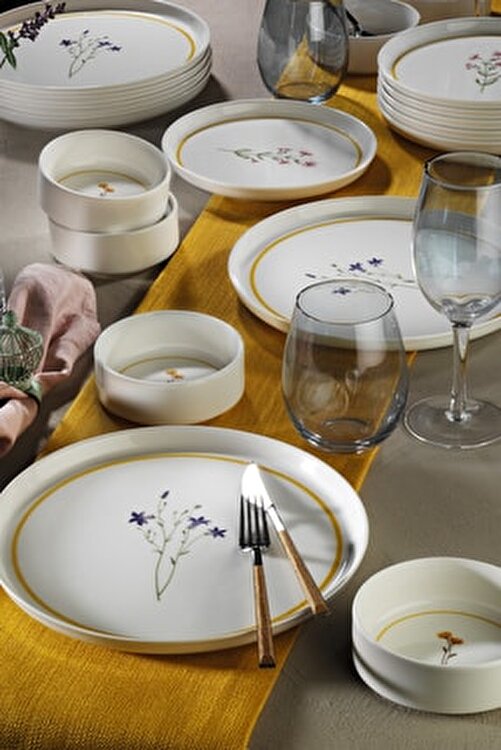 Güral Porcelain Iris 18 Pieces Dining and Serving Set Material: Porcelain Number of Persons: 6 Pieces Number of Pieces: 18 Pieces Consists of 6 Pieces 25 Cm Serving Platters, 6 Pieces 21 Cm Cake Plate, 6 Pieces 12 Cm Soup Bowl. Made in Turkey. Thanks to its smooth surface, it does not stain.