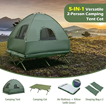 Features: Complete set includes camping tent, camping cot, air mattress & air pillow with cover, sleeping bag 5-in-1 camping tent cot is available for combination use and separate use 4 Double-layer mesh window promotes excellent ventilation Off-ground design keeps you from wet and muddy ground Ground stakes and wind ropes increase wind-resistance X-shaped legs and anti-slip pads provide strong support Foot air pump and convenient inflation valve allows for quick inflation Easy to be folded and packed in the carry bag for hiking, travel, camping