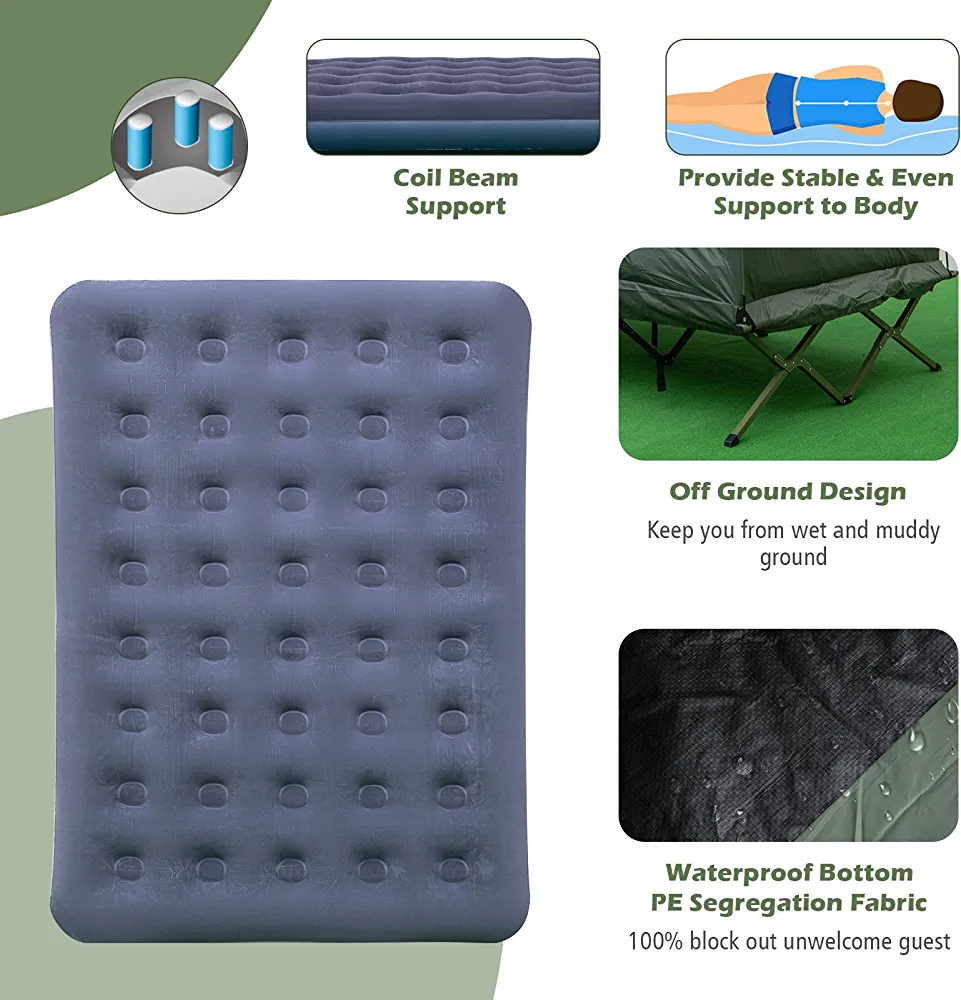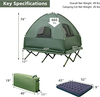 Specifications: Color: Green & Blue Material: Metal, FRP, 190T PU-Coated Polyester, PE Oxford Overall Dimension: 77” x 35” x 66” Inner Size of Tent (Combined State): 73” x 30” x 40” Size of Air Mattress: 30” x 73” x 9” Size of Carry Bag: 36” x 10” x 10” Height of Camping Bed: 17” Size of Pillow: 17” x 11” x 4.5” Load Capacity: 330 lbs Net Weight: 29lbs