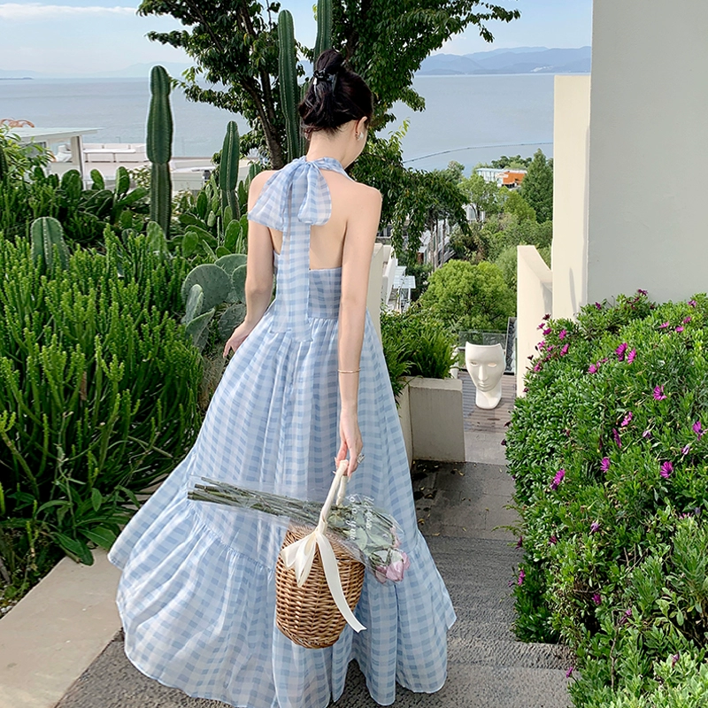 Hainan Sanya travel wear photo beach dress seaside vacation blue plaid halterneck dress super fairy summer