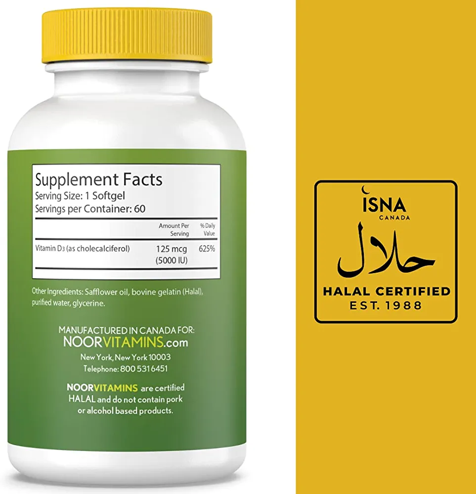 | nameOriginal | Noor Vitamins Halal Vitamin D, Halal Vitamin D3, 5000 IU Softgels, Supports Bone, Immune & Heart Health, from Safflower Oil to Maximize Absorption, Non-GMO, Gluten Free & Halal (60 Count)… |