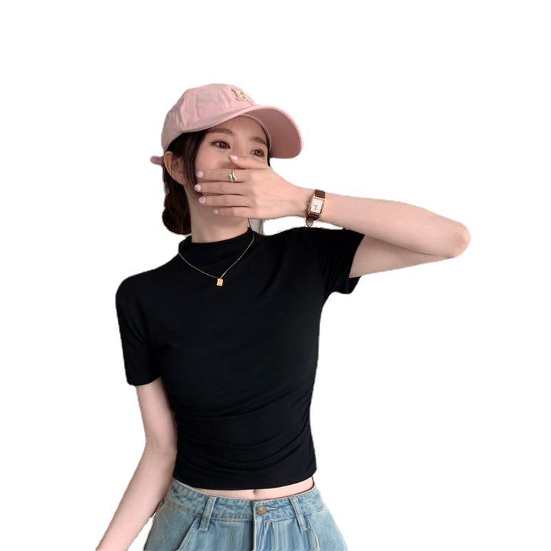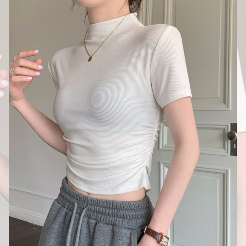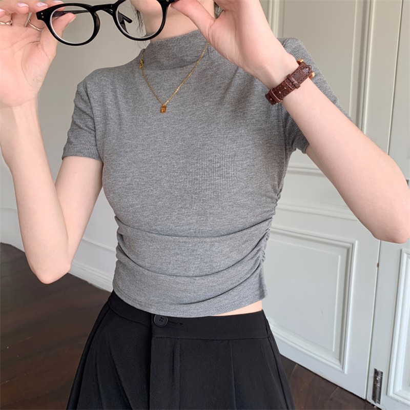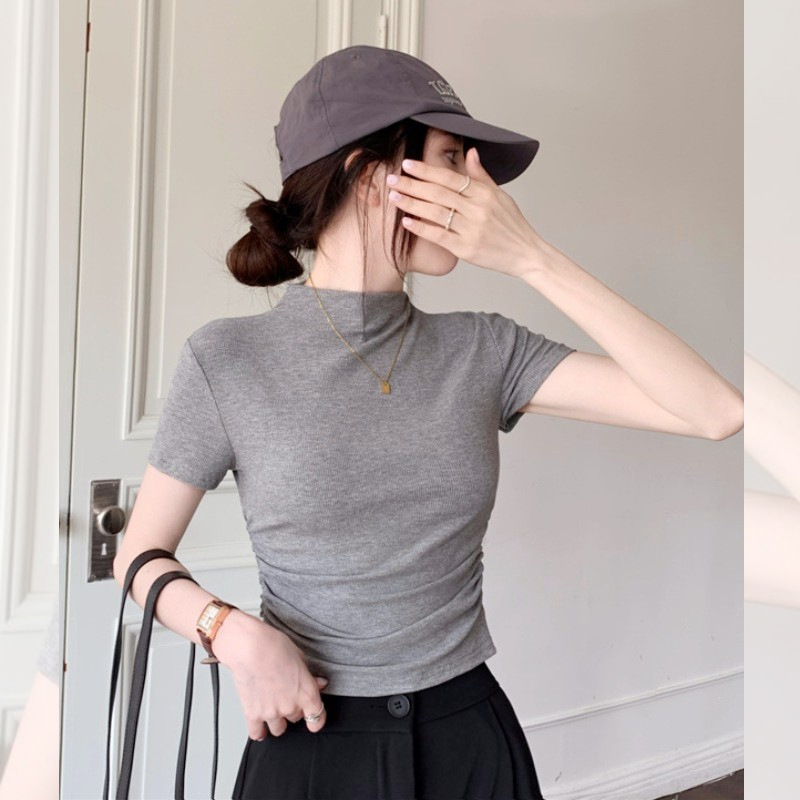 Half-high Collar Pleated Short-sleeved Base Shirt Women's 2024 Summer New Stylish Short Chic T-shirt Top for Petite