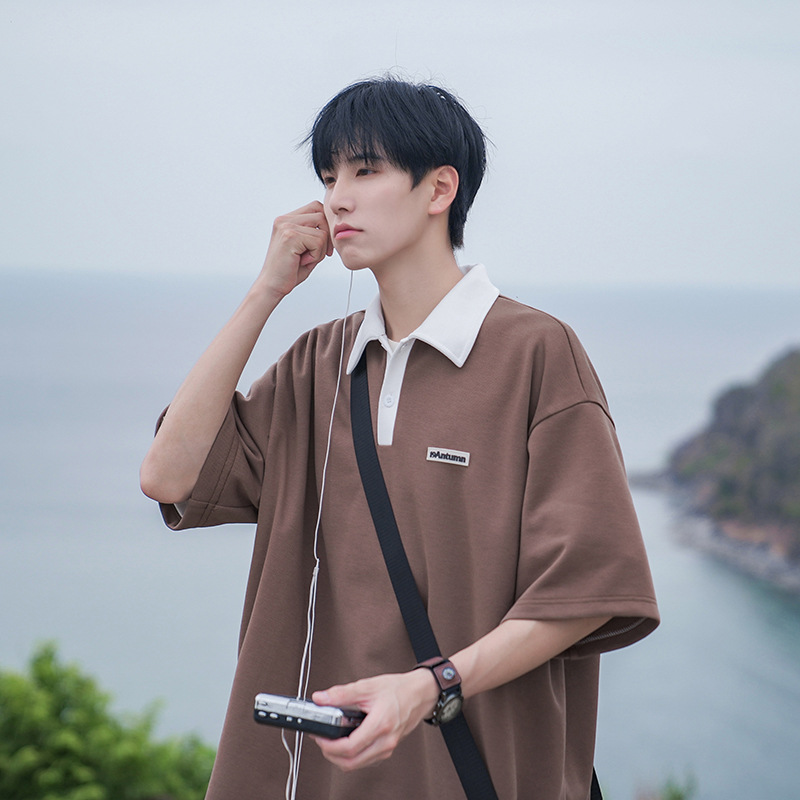 | nameOriginal | Half sleeve polo shirt men's summer Japanese retro fashion brand contrast color lapel top loose casual heavy short sleeve t-shirt |
