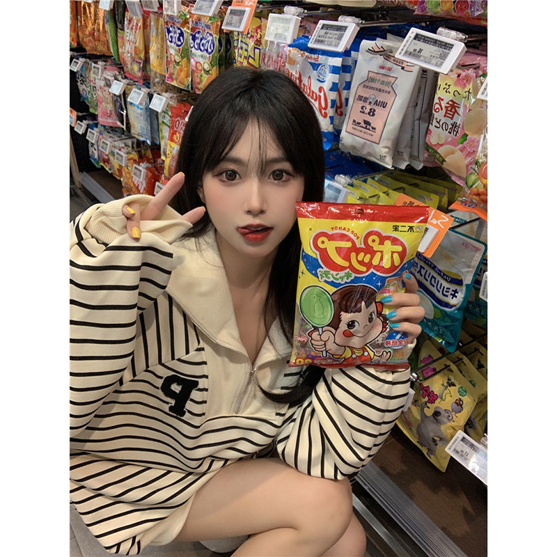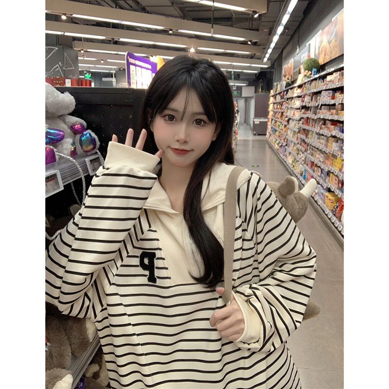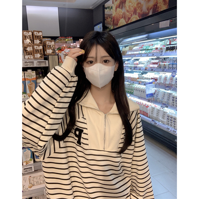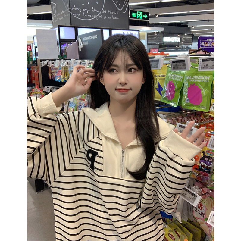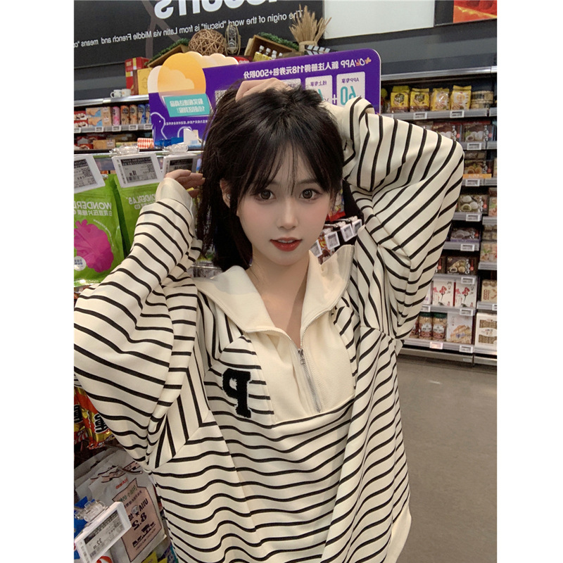 | nameOriginal | Half Zip POLO Collar Sweatshirt Women's Spring 2024 New Style Striped Loose BF Style Mid-length All-match Long-sleeved Top |
