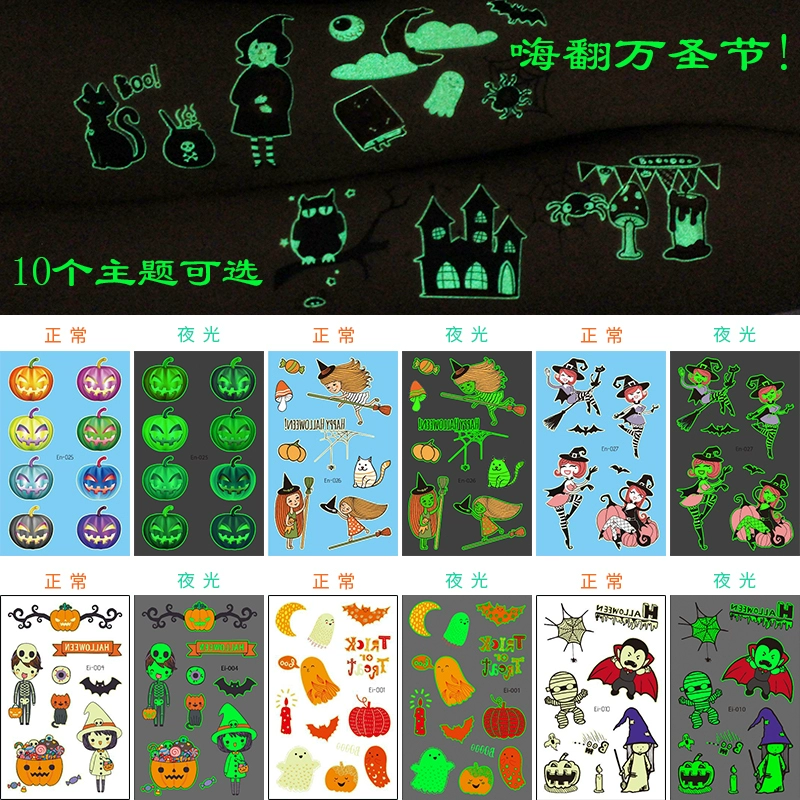 | nameOriginal | Halloween children's tattoo stickers flash luminous stickers safe and non-toxic fluorescent luminous makeup cartoon tattoo stickers |
