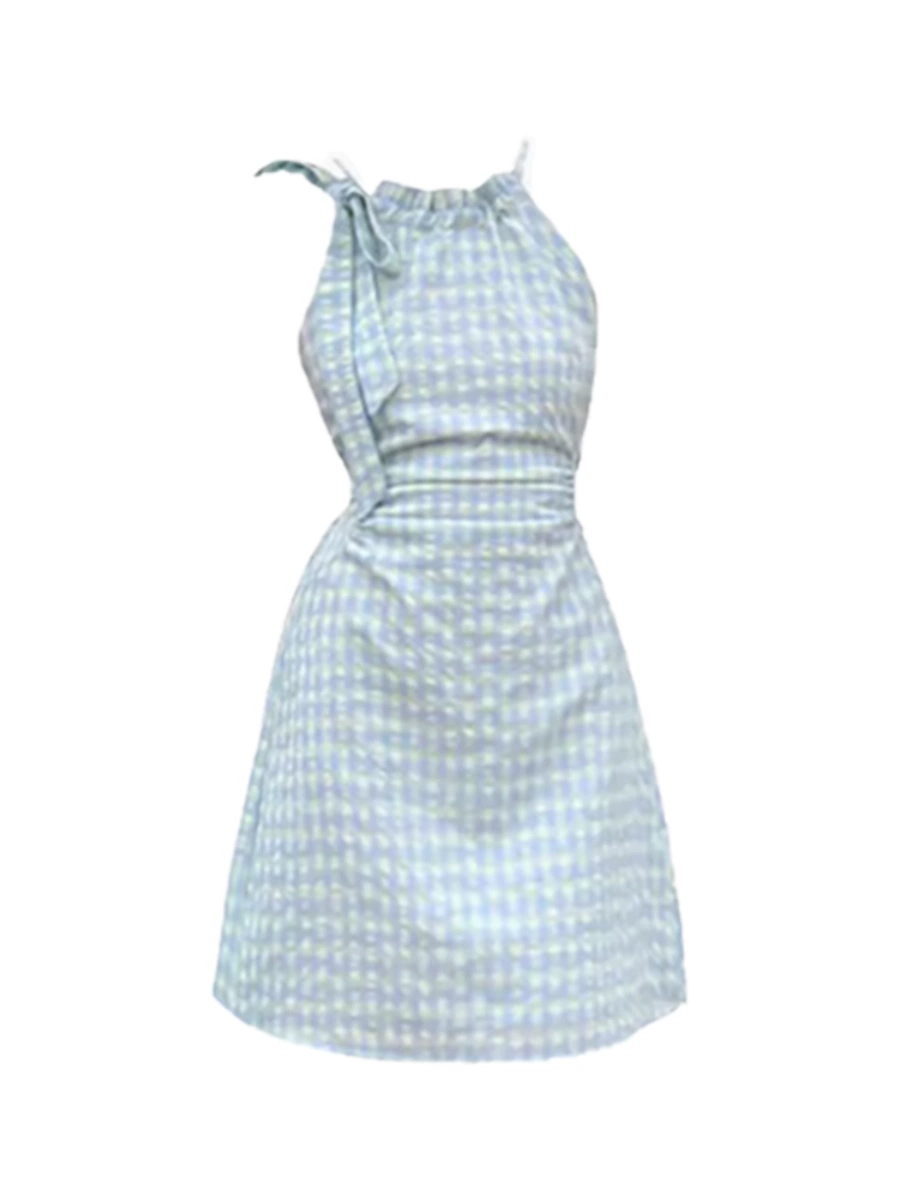 | nameOriginal | Halter neck suspender temperament blue plaid dress women's 2024 new sleeveless waist long skirt |