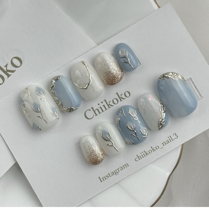 Hand-worn nails, fake nails, phototherapy nails, finished products, gilded retro high-end hand-painted blue tulip manicure INS