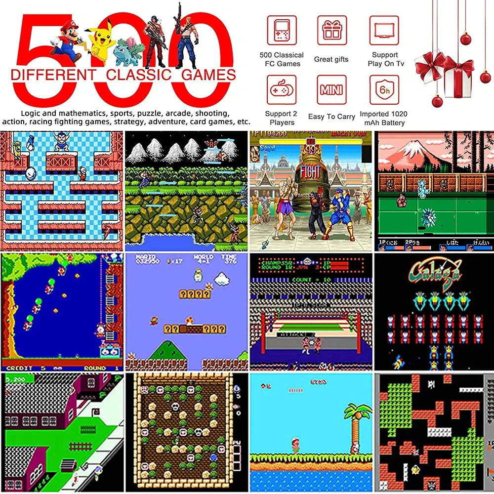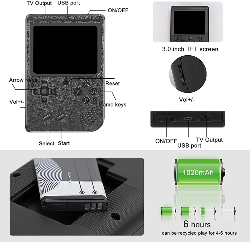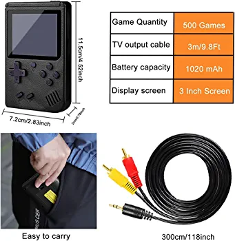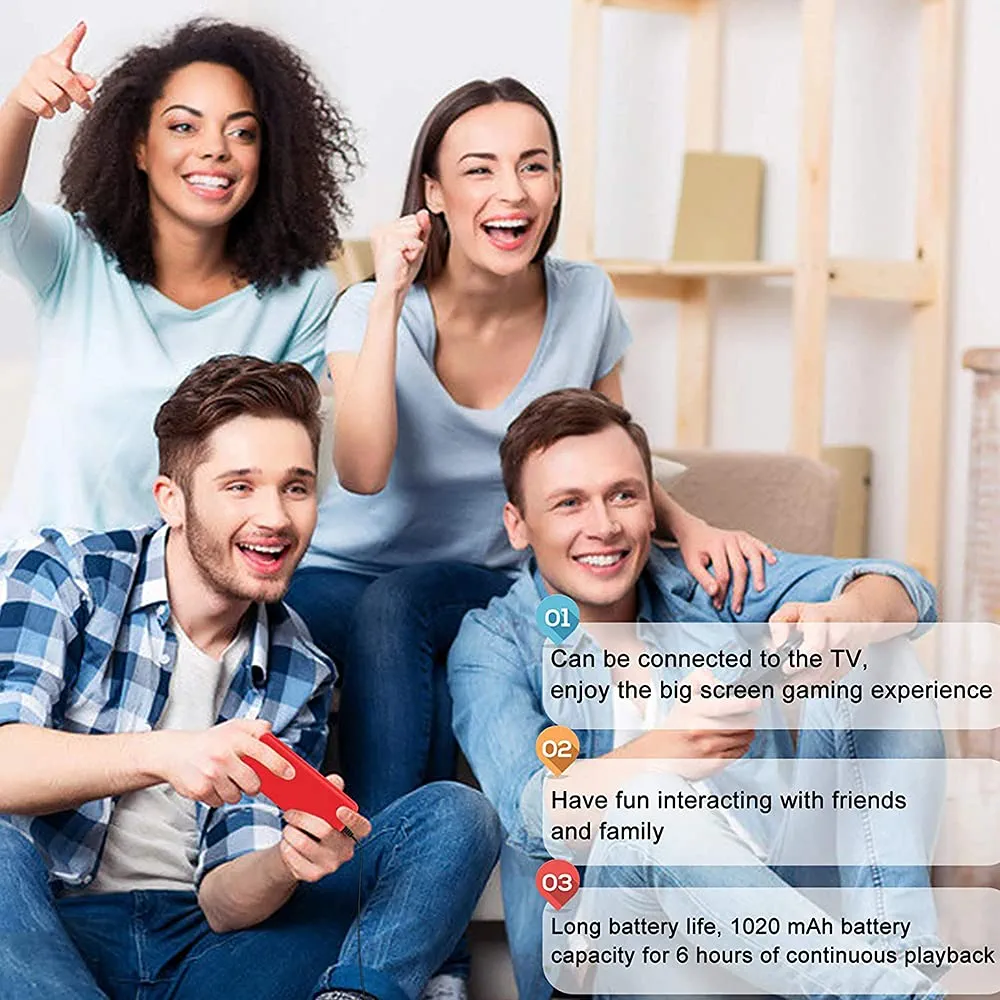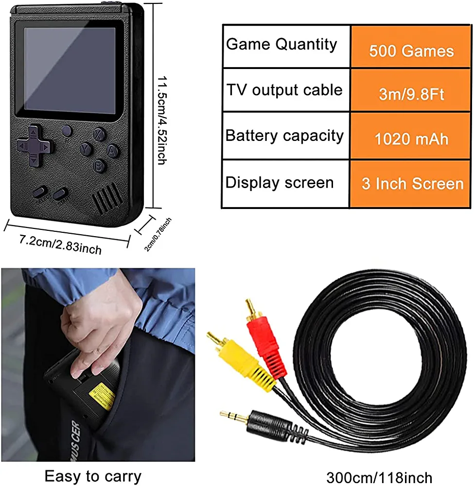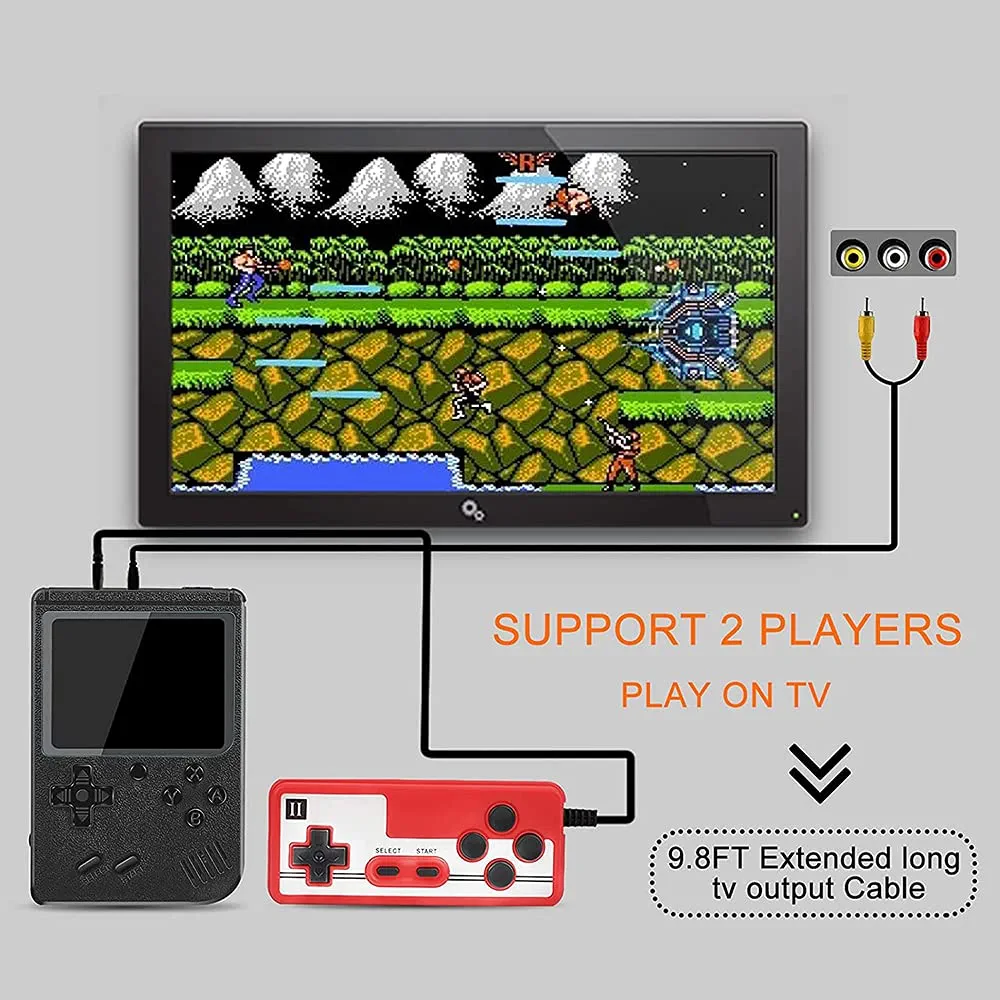 This console supports two players and can be connected to a TV for a bigger screen experience. It comes with a gamepad, USB cable, and AV output cable. The compact and lightweight design makes it easy to carry in a mini case, bag, or pocket.