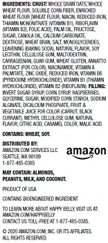 This Amazon brand breakfast bar comes in a 10.4 ounce box with 8 individually wrapped bars, each weighing 1.3 ounces. It contains 10g of whole grain per serving and is free from artificial flavors. The product is Kosher certified and contains wheat and soy. It may also contain almonds, peanuts, milk, and coconut. The brand offers a satisfaction guarantee, promising to refund the purchase price within a year of purchase if the customer is not satisfied.