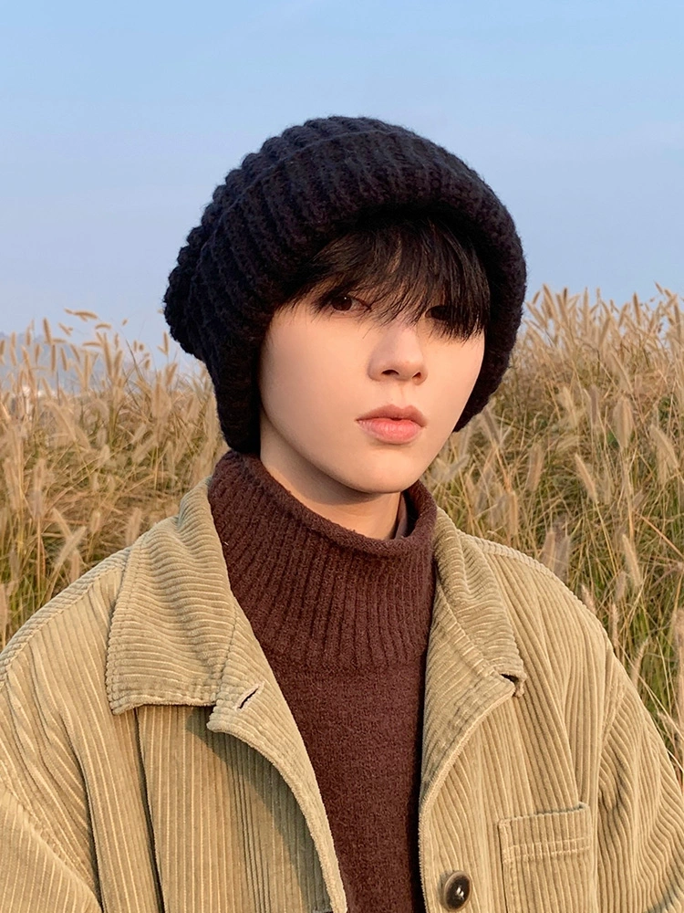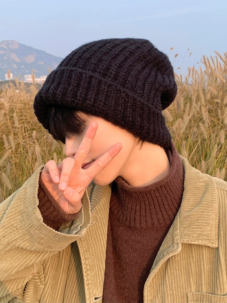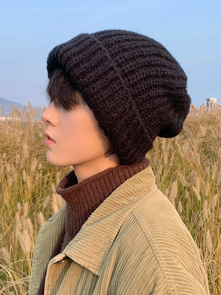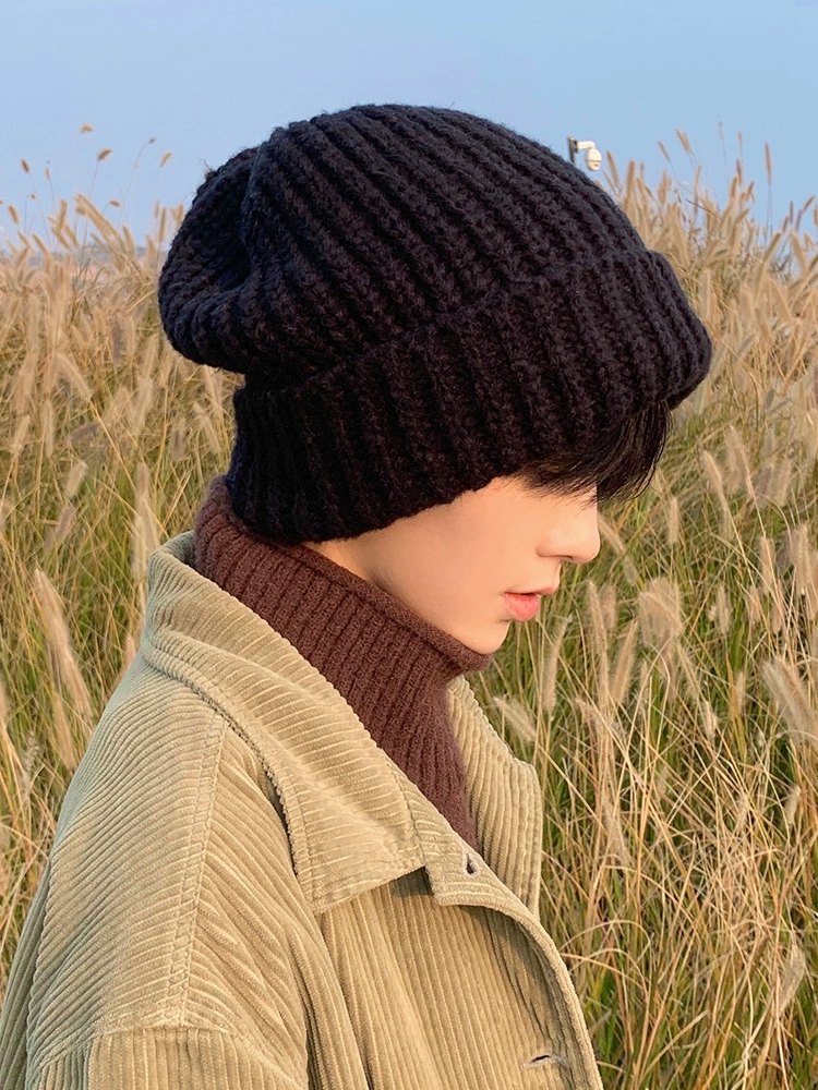 Hat men's winter trendy men's thick knitted hat men's loose large head circumference black woolen hat men's pile hat autumn and winter