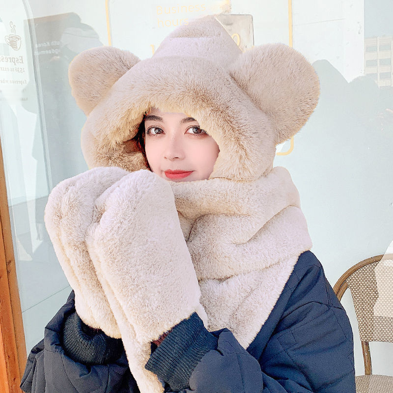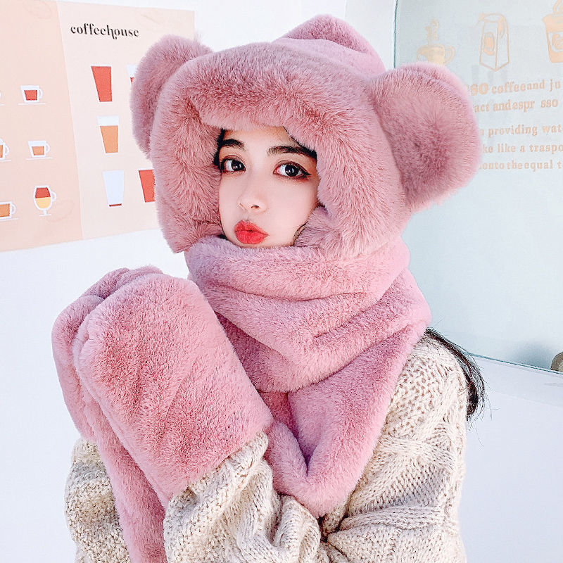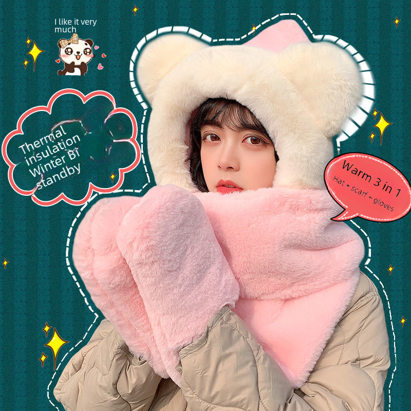 Hat Women’s Autumn and Winter Bear Thickened Warm Internet Popular All-match Cute Plush Scarf Three-piece One-piece Hat