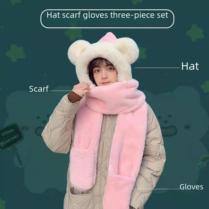 Hat Women's Autumn and Winter Bear Thickened Warm Internet Popular All-match Cute Plush Scarf Three-piece One-piece Hat