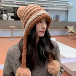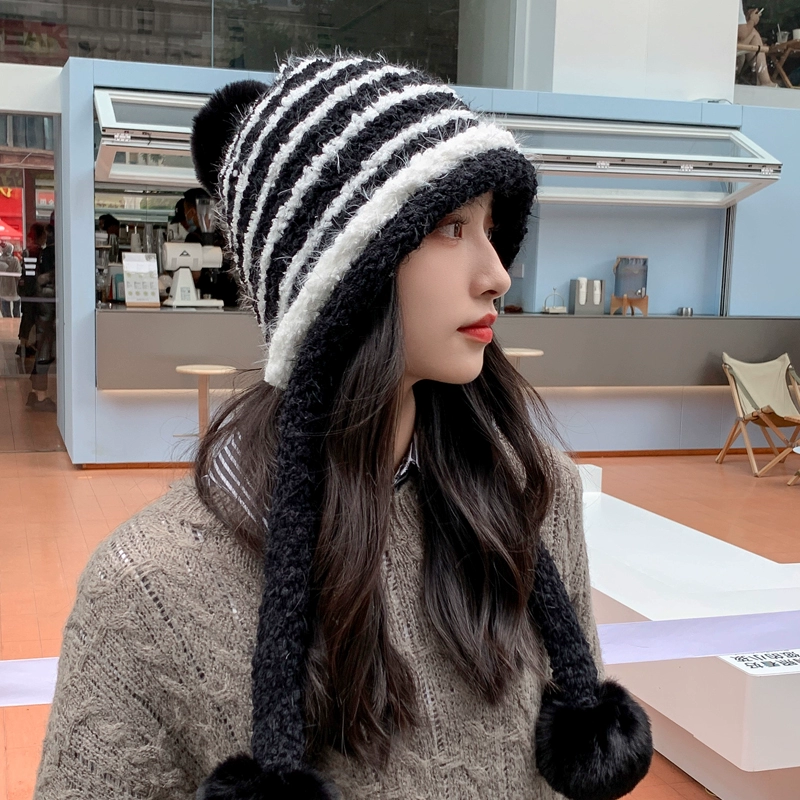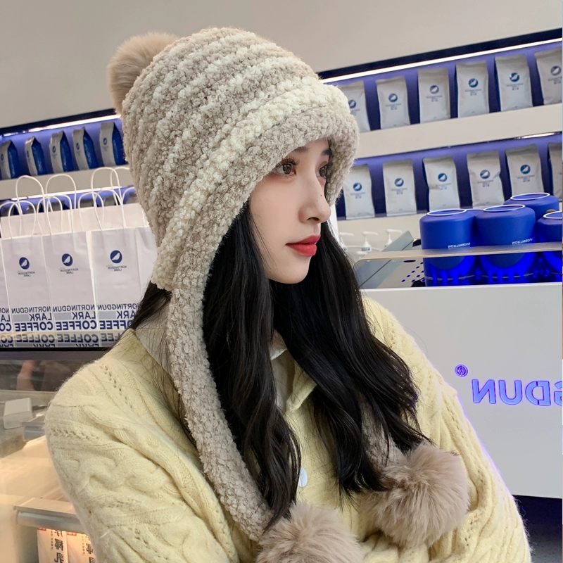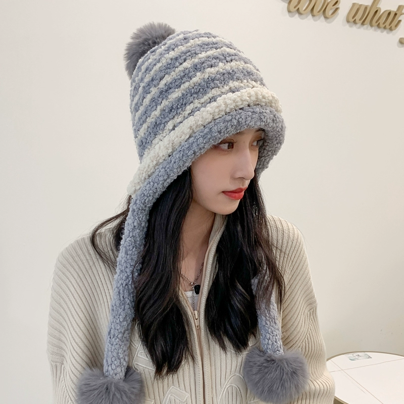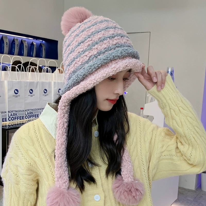 Hat Women’s Autumn and Winter Plush Woolen Hat Cute Fashionable Super Cute Knitted Hat Striped Thick Warm Ear Protector Hat Shows Small Face