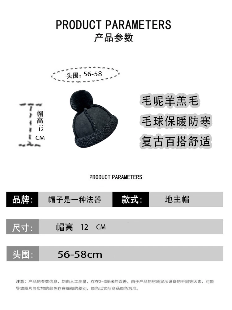 | nameOriginal | Hat Women's Cute Fur Ball Landlord Hat Autumn and Winter Versatile Lamb Hair Plus Velvet Warm Melon Skin Hat Beret Parent-Children |