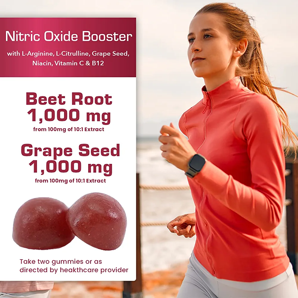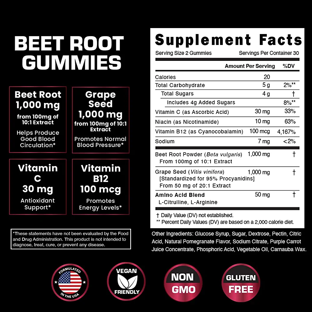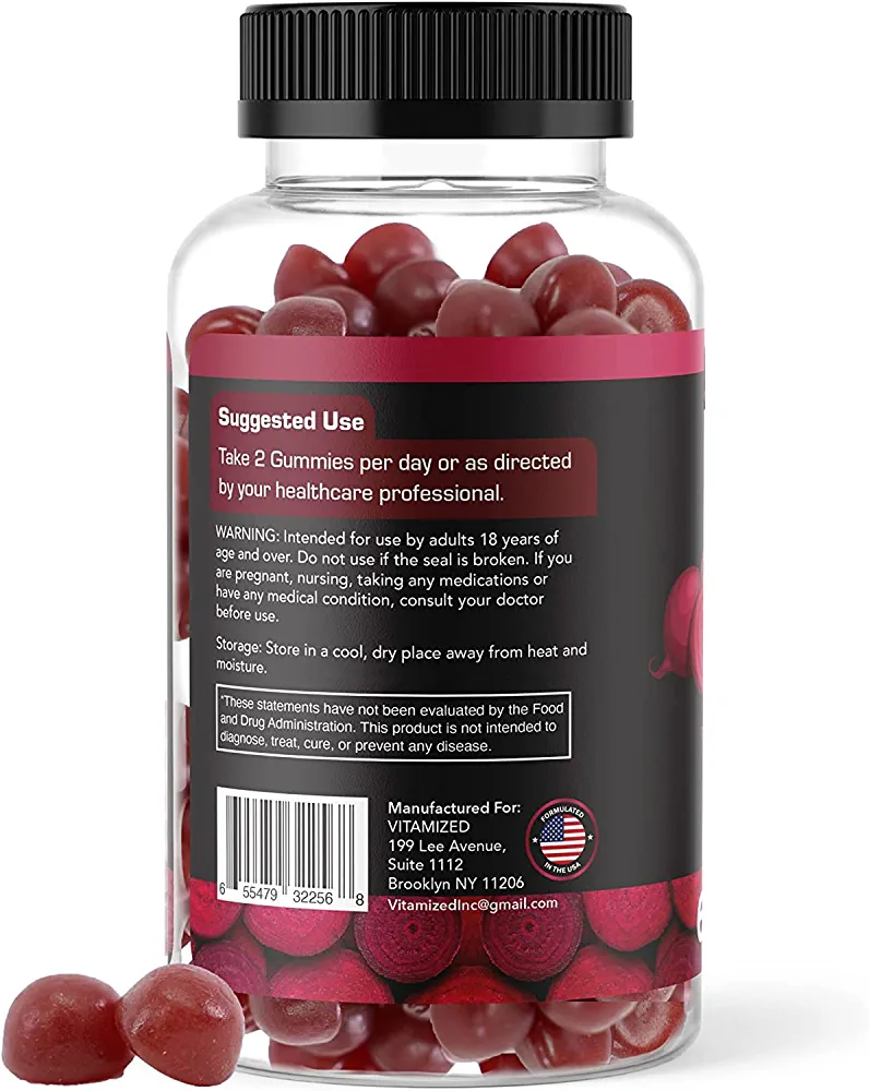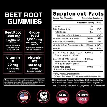 The supplement is easy to take, as it comes in the form of delicious pomegranate-flavored gummies. Just two chews a day can help keep your health in check. The product is 100% vegan and GMO-free, made from carefully selected ingredients, including pure beet root powder and grape seed. It is free of gluten and dairy, making it suitable for a wide range of dietary needs.