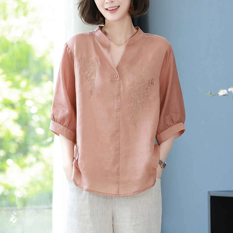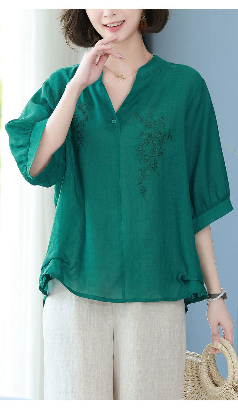 | nameOriginal | Heavy embroidery V-neck cotton and linen shirt with three-quarter sleeves and art |