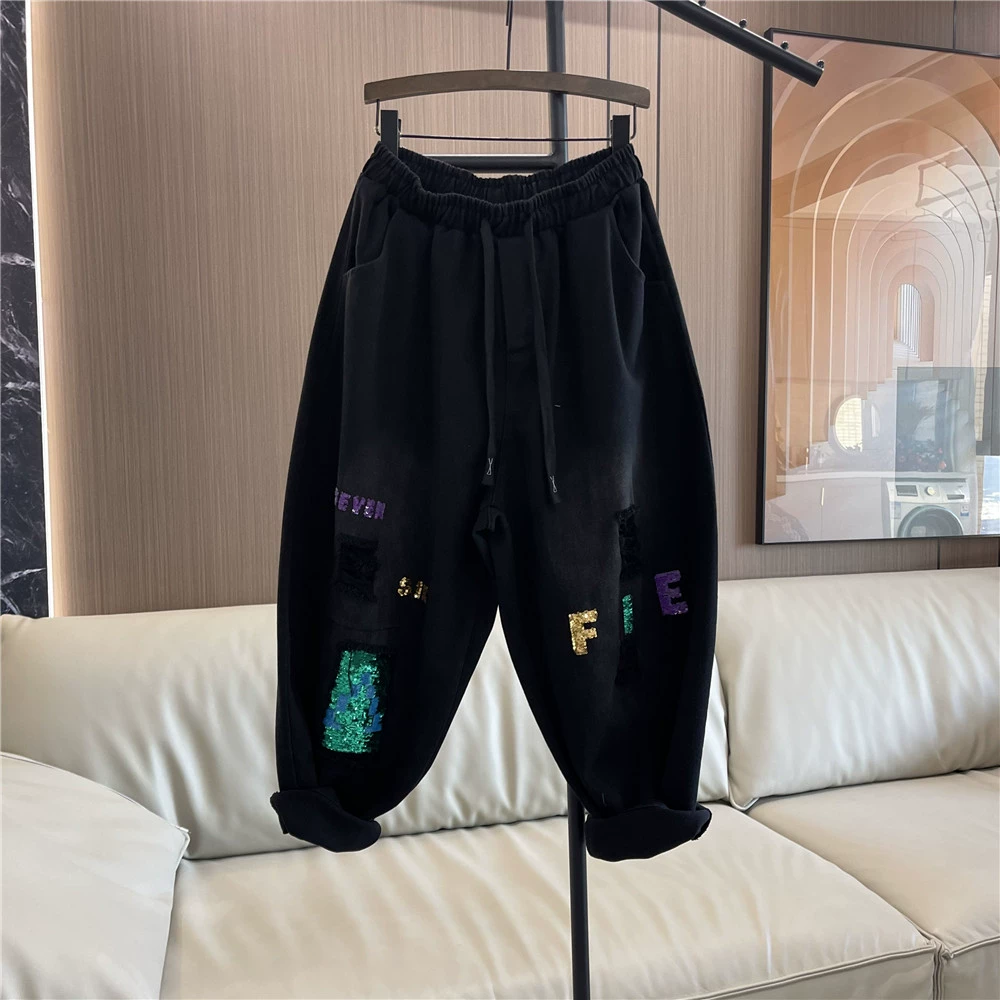 | nameOriginal | Heavy industry ripped spring and summer elastic waist dad pants with sequins |
