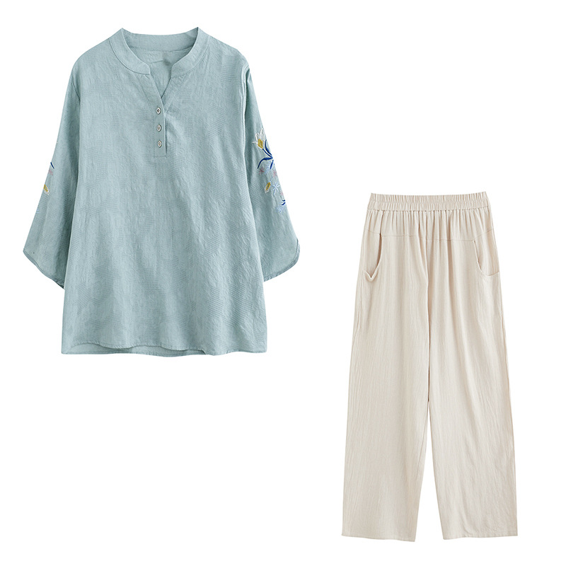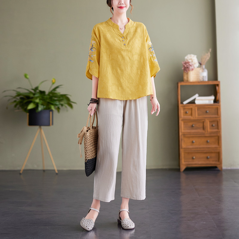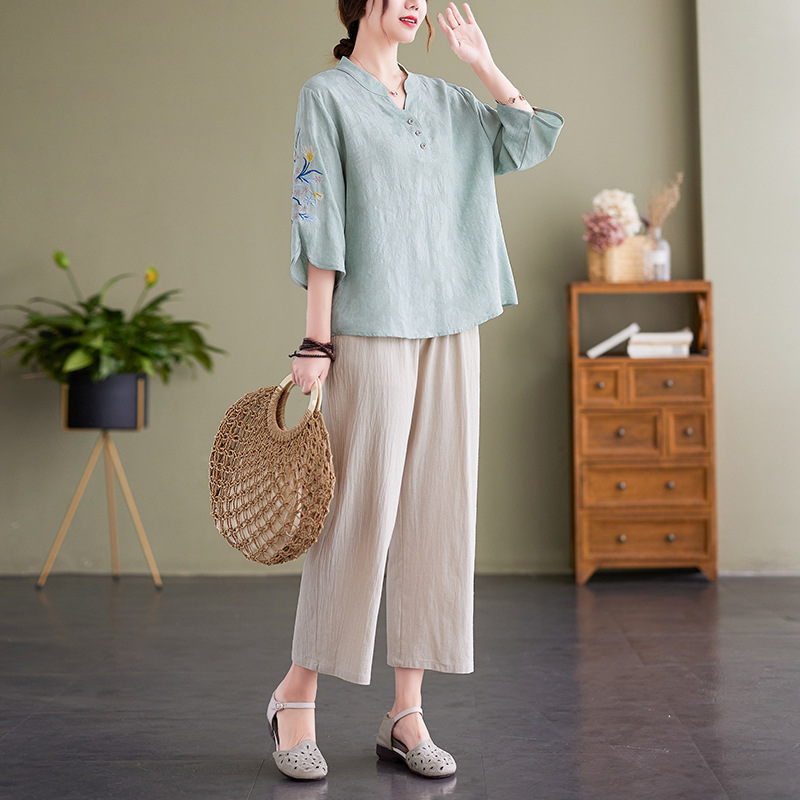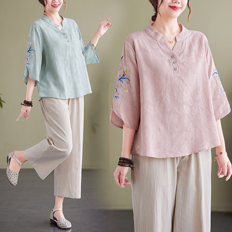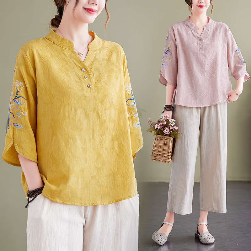 Heavy Industry Three-Dimensional Embroidered Flower Mid-Sleeve Collar Shirt Women's Spring New Retro Buckle Loose Seven-point Sleeve Shirt for Women