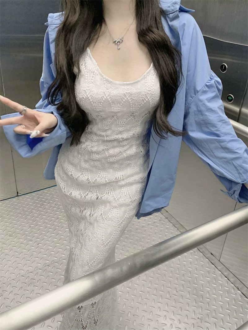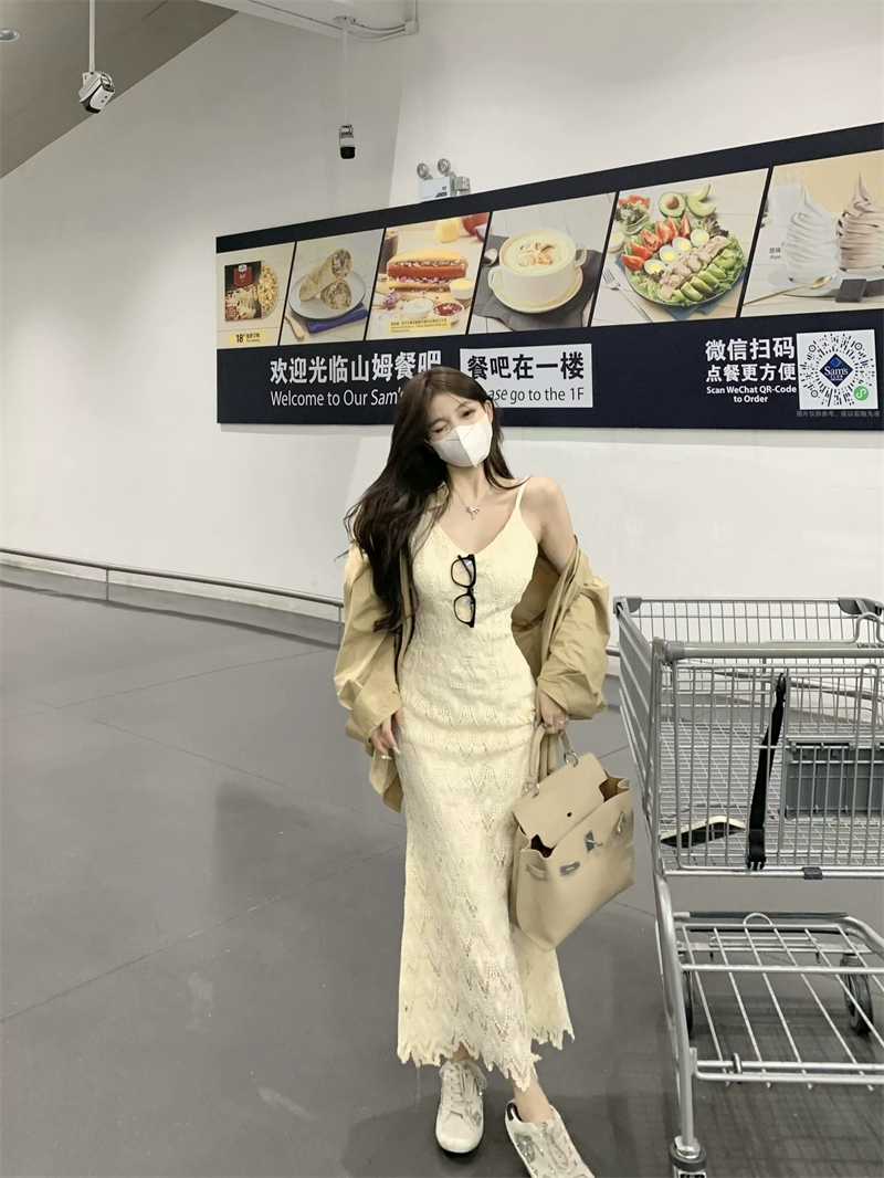 Heavy industry V-neck suspender dress with temperament A-line lace