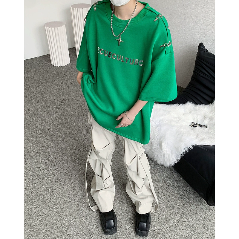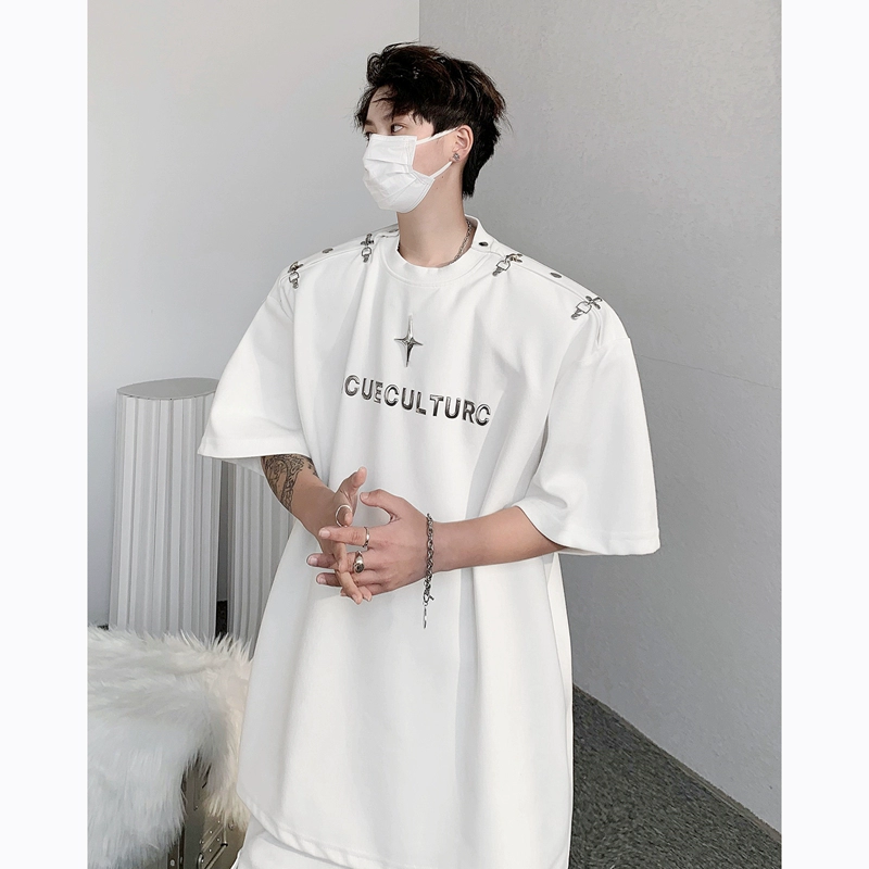 | nameOriginal | Heavy shoulder padded metal buckle deconstructed half-sleeved trendy top |