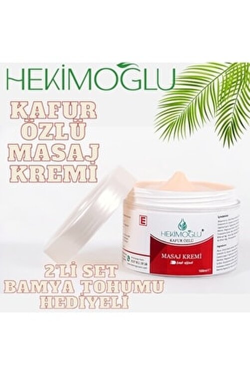 Hekimoğlu Camphor Essential Massage Cream 100 ml + 100 g Okra Seed Gift Use Information: *It is recommended to apply to the skin as a circular massage. *Externally applied to the skin. *Do not apply to cracked or irritated skin and close to the eyes. Storage Conditions: *Store in a cool and dry place, away from sunlight and in its own packaging. *Keep away from children 0-6 years old. *Do not contact the eye. Otherwise, apply to your docture. Ingredients: Deionized Water, Cetyl Stearyl Alcohol, Glyceryl Stearate, Ceteareth-25, Glycerol, White Daily Oil, Caprylic/Capric Triglycerinde, Dimethicone, Menthol, Sodium Chondroitin Sulfate, Glucosamine Sulfate, Camphor, Thyme Oil, Eucalyptus Oil, Rosemary Oil, Mint Oil, Shark K Oil, Chili Pepper Oil, Phonexyehanol