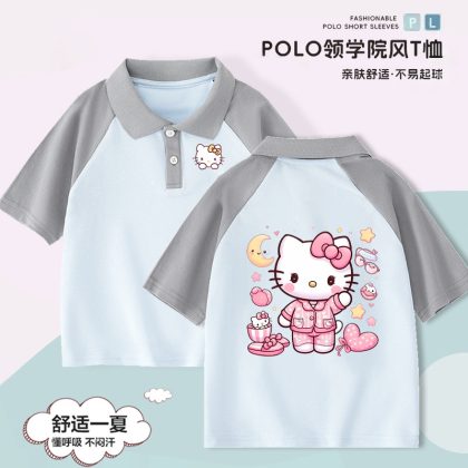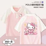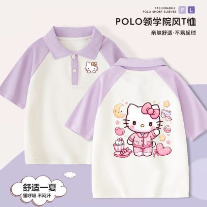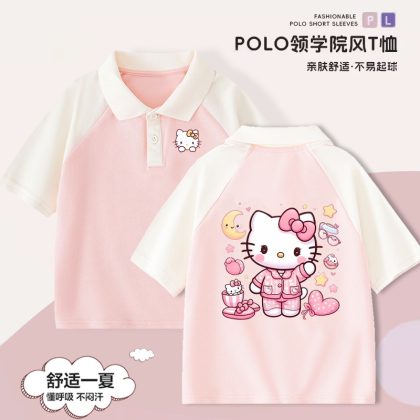 Hello Kitty Girls’ Short-sleeved T-shirt Children’s Western Style Polo Shirt Large Children’s Summer 2024 New Style Western Style Top for Summer