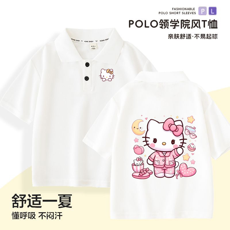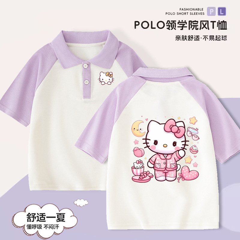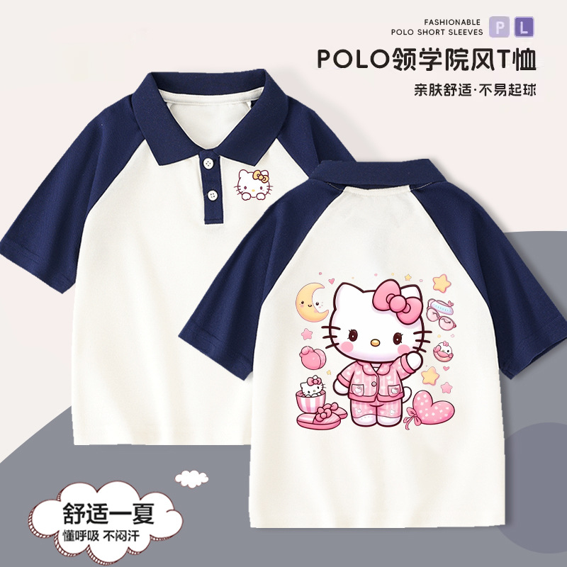 Hello Kitty Girls' Short-sleeved T-shirt Children's Western Style Polo Shirt Large Children's Summer 2024 New Style Western Style Top for Summer