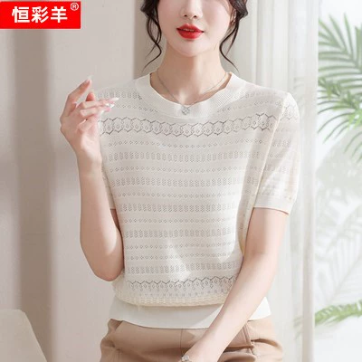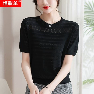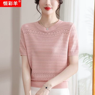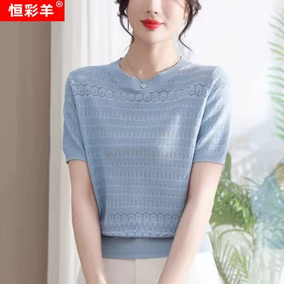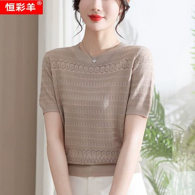 Hengcai sheep short-sleeved knitted sweater for middle-aged mothers in mulberry silk